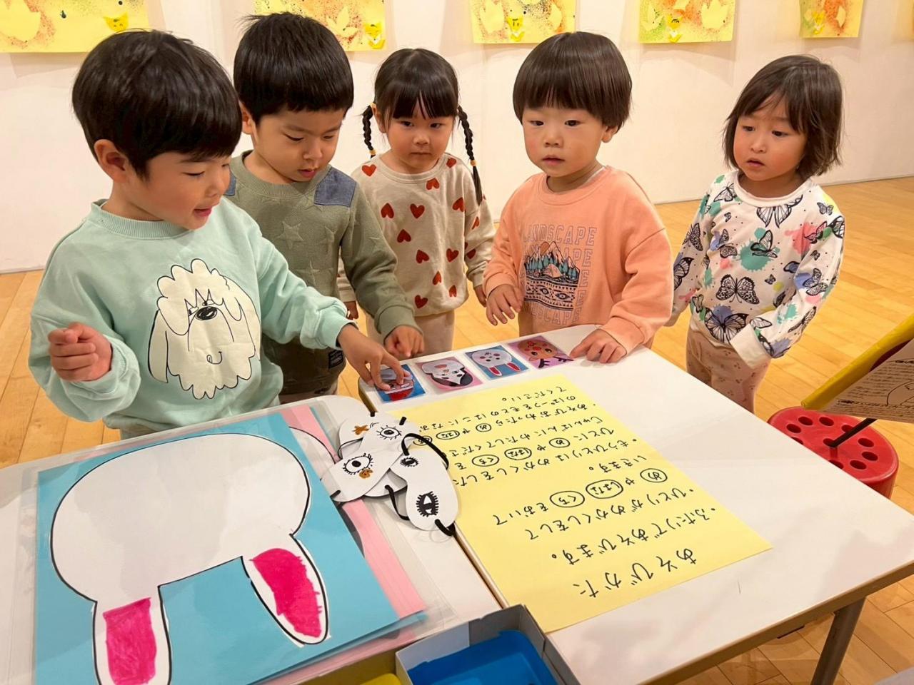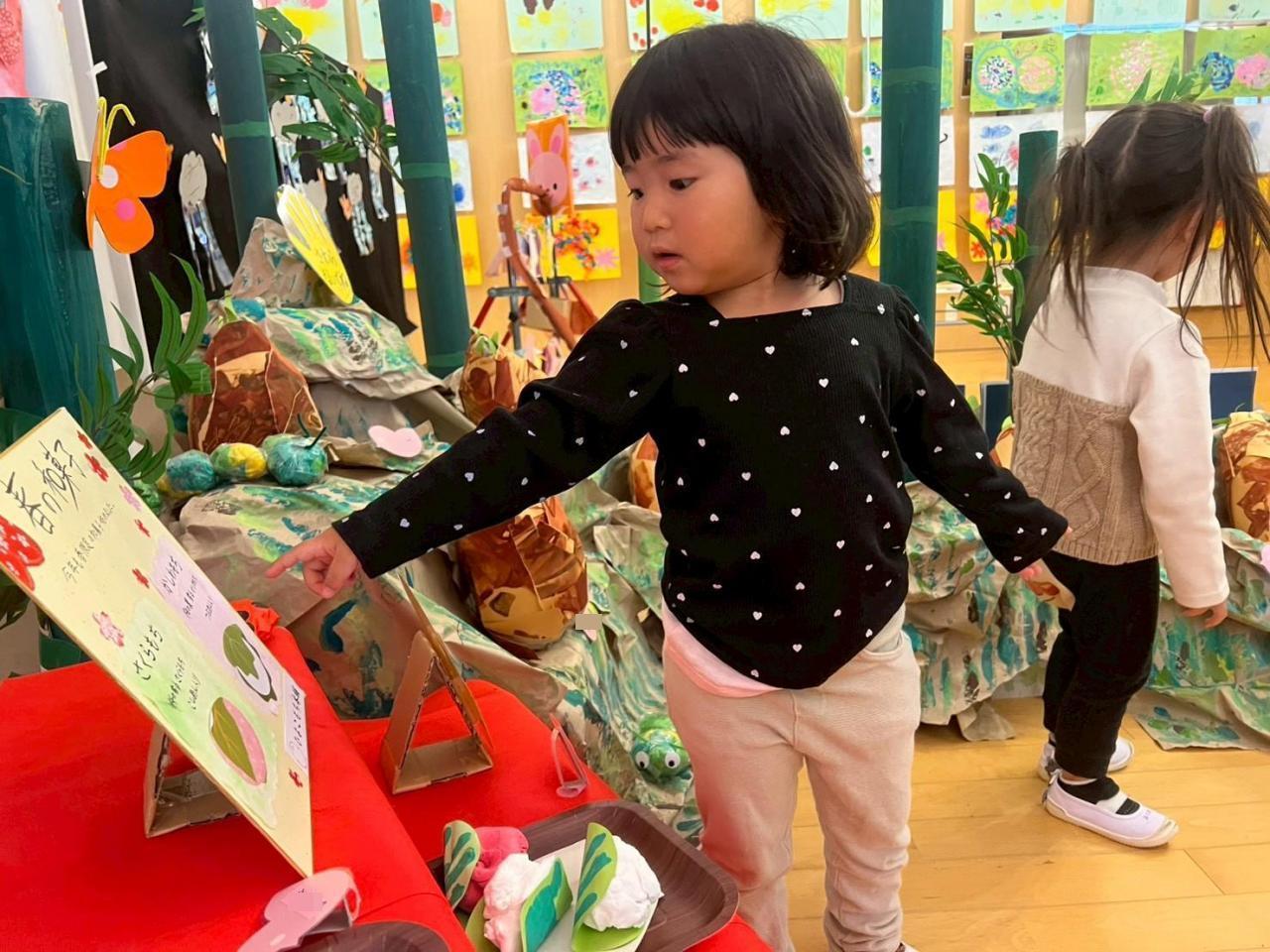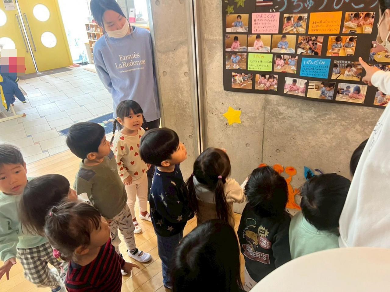 うさぎぐみのみんなで、作品展を回りました~😁✨階段の飾りからお友だちを見つけて「○○ちゃんいたよ‼️」と嬉しそうに教えてあげていました😊