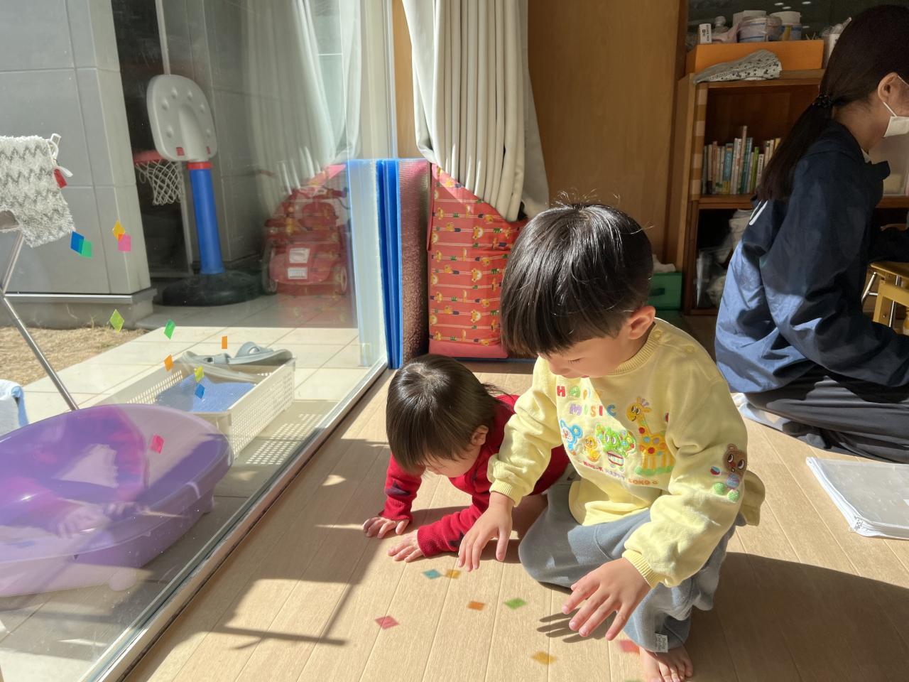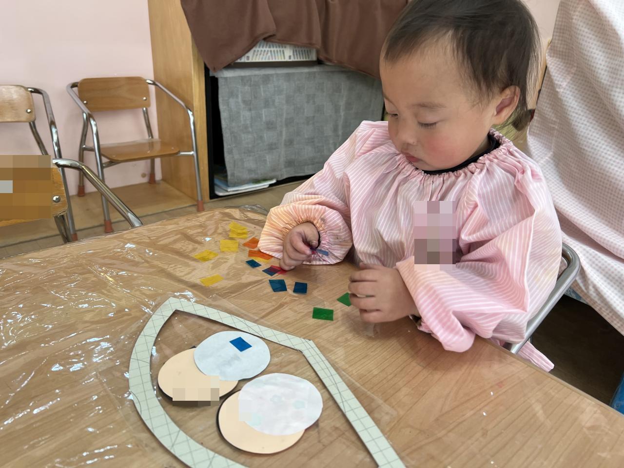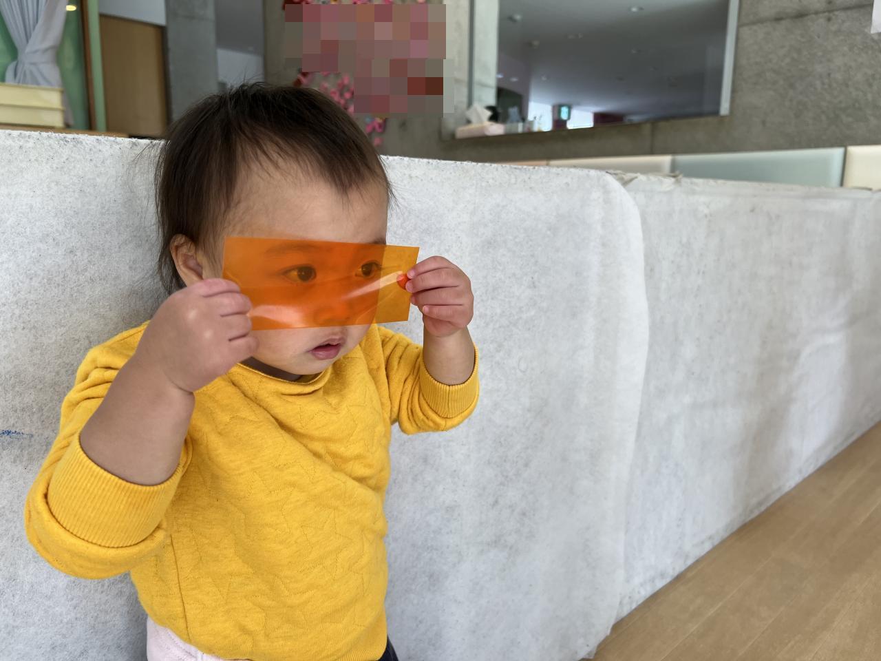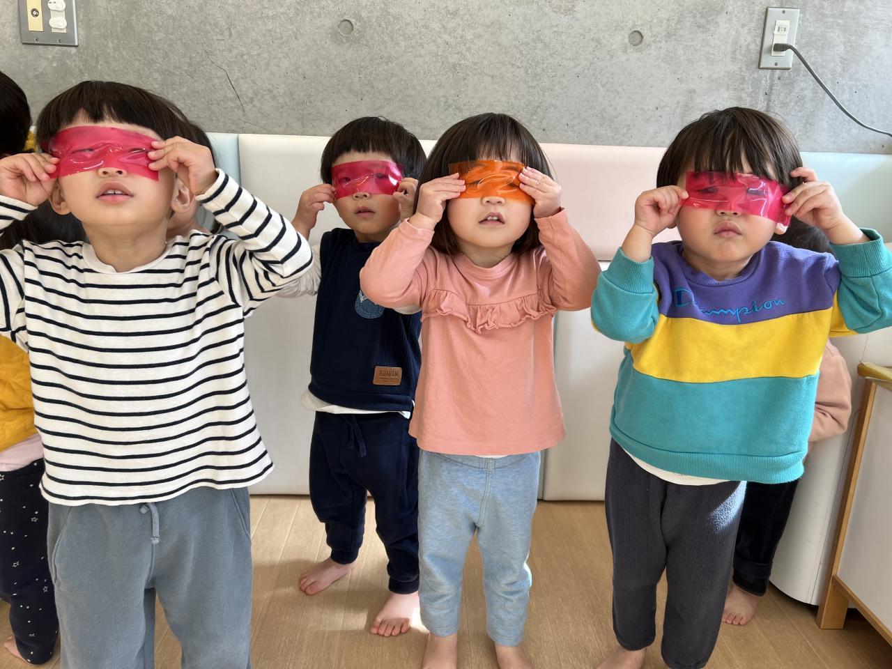 ステンドグラスシートは窓に貼ったり、めがねに見立てて色の世界を楽しみました🧡💛🩵