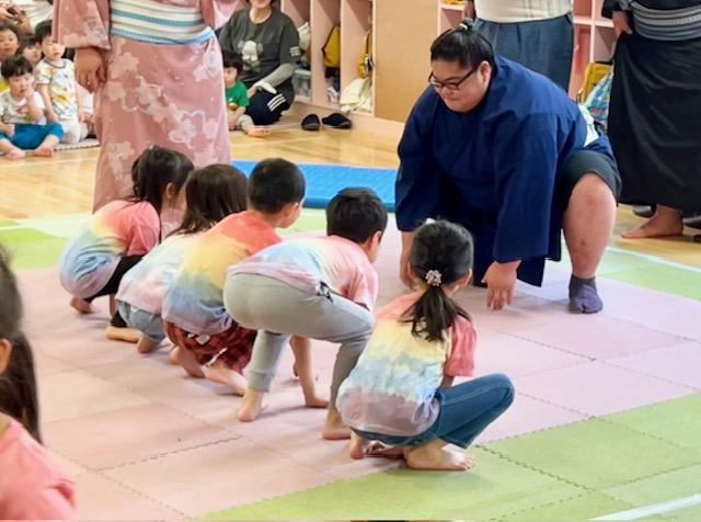 まぢかでお相撲さんを初めてみる子がほとんどで、初めは泣いている乳児クラスのお友だちもいましたが、最後の方には立ち合いの姿勢をとっていたりで、大人もビックリのおすもう体験会でした。