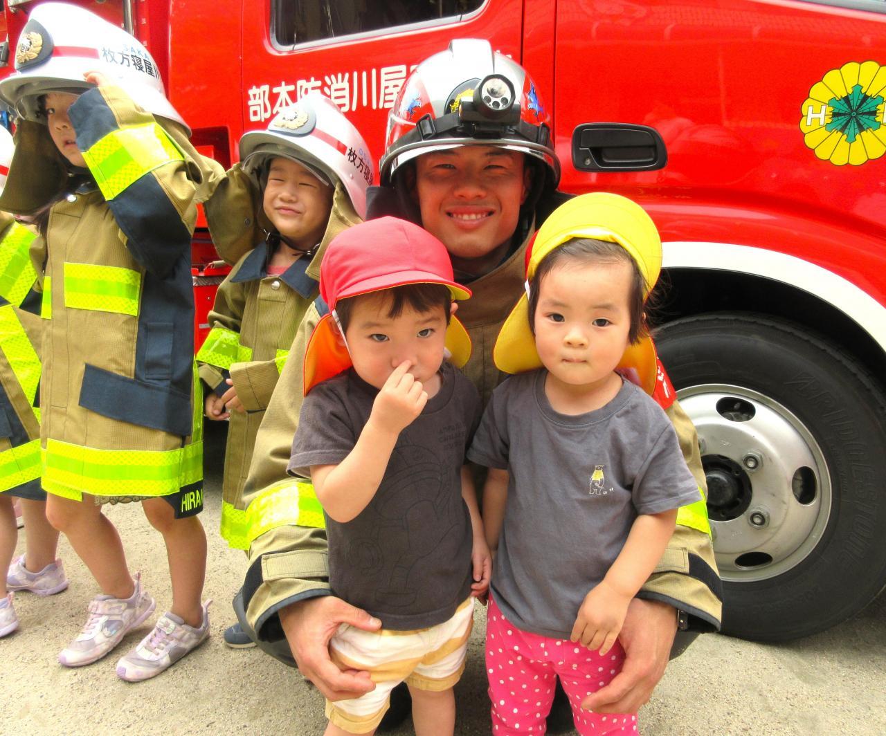 そしてこどもたちのお待ちかね!消防車両の見学をしました🥰。優しい消防士の方々に消防車の説明をしてもらったり、抱き上げてもらったりと、交流もたっぷりできて笑顔いっぱいのこどもたちでした。