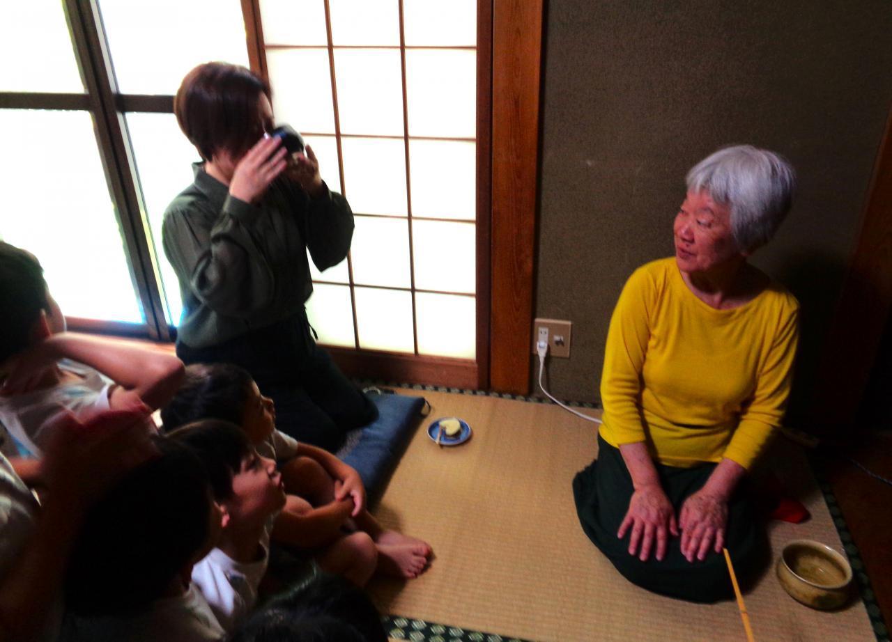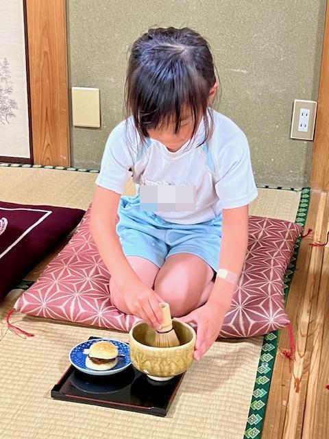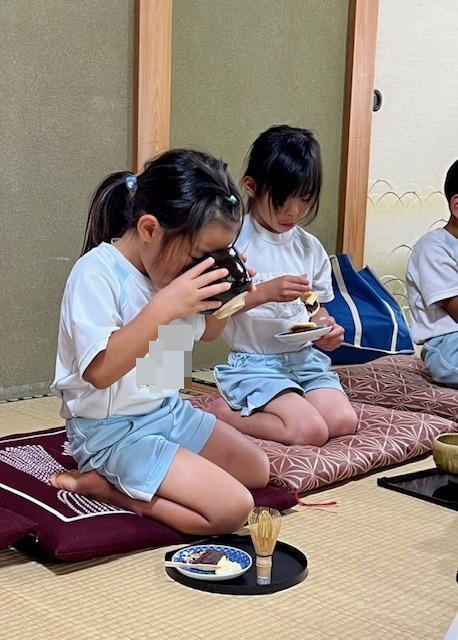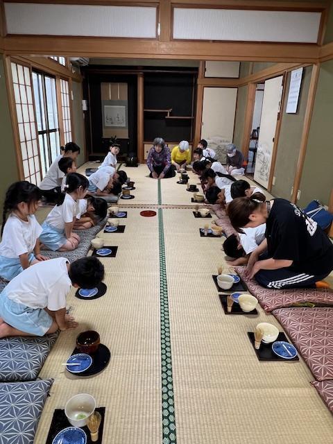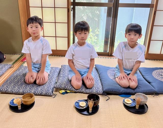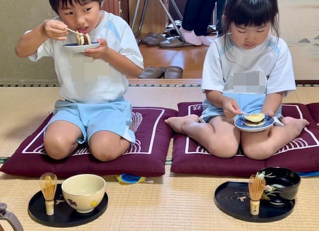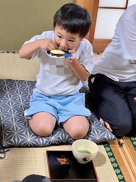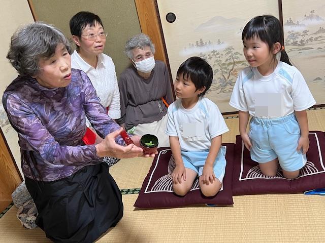 出発前からワクワクドキドキのきく組さん。お隣の自治会館に入って座布団に座る姿は、ちょっと緊張した面持ちでしたが、やさしいおばあちゃま方に丁寧に教えてもらって、美味しそうにお茶とお菓子を頂きました。