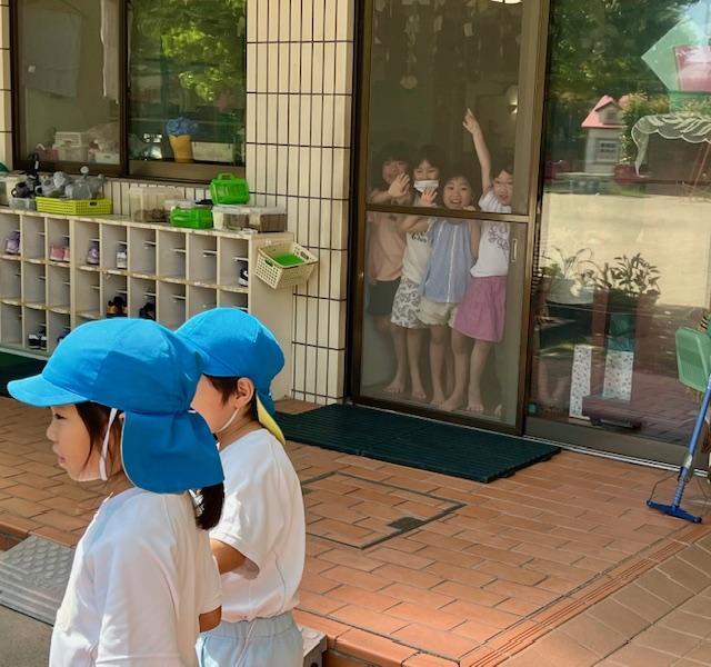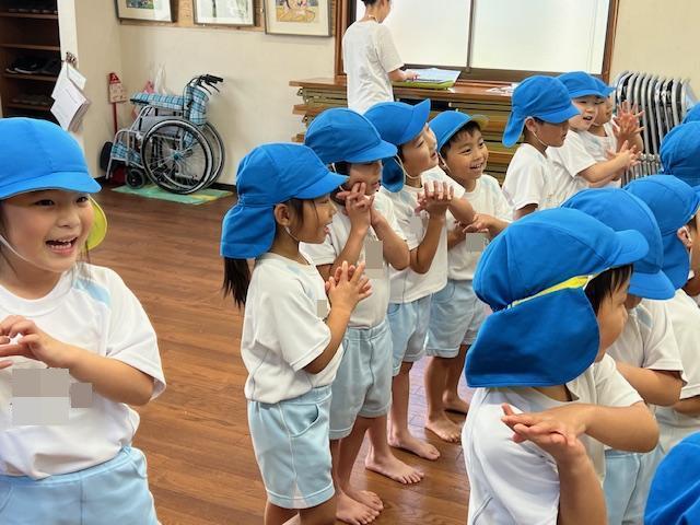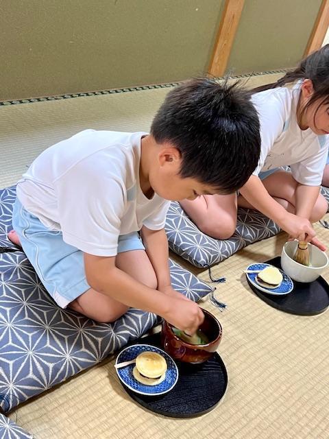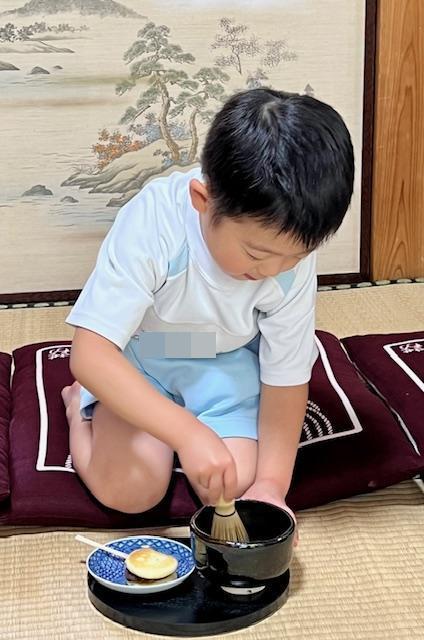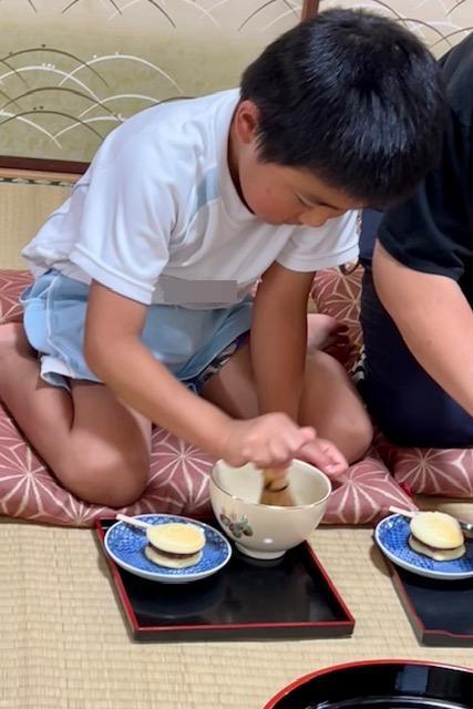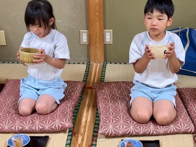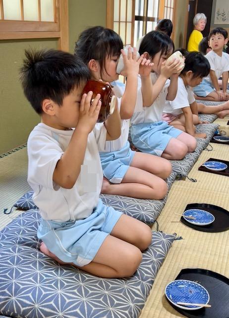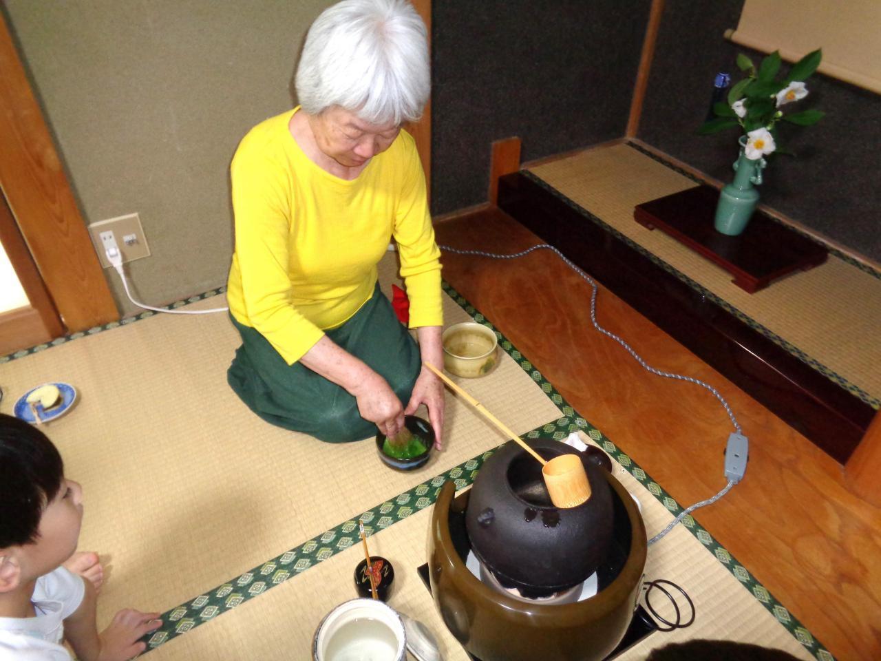 出発前からワクワクドキドキのきく組さん。お隣の自治会館に入って座布団に座る姿は、ちょっと緊張した面持ちでしたが、やさしいおばあちゃま方に丁寧に教えてもらって、美味しそうにお茶とお菓子を頂きました。