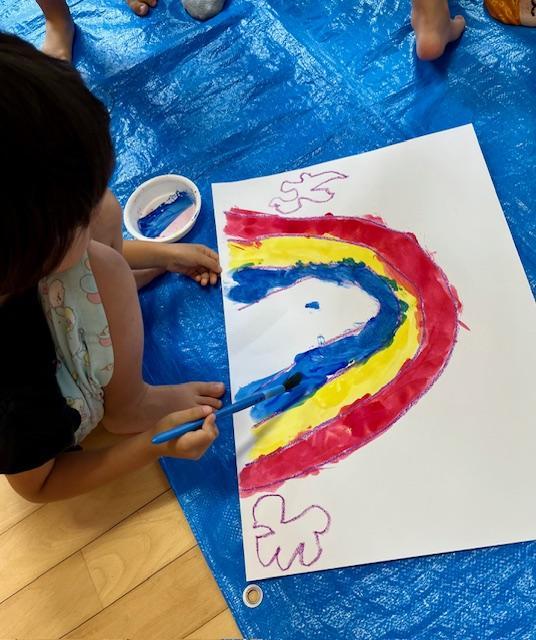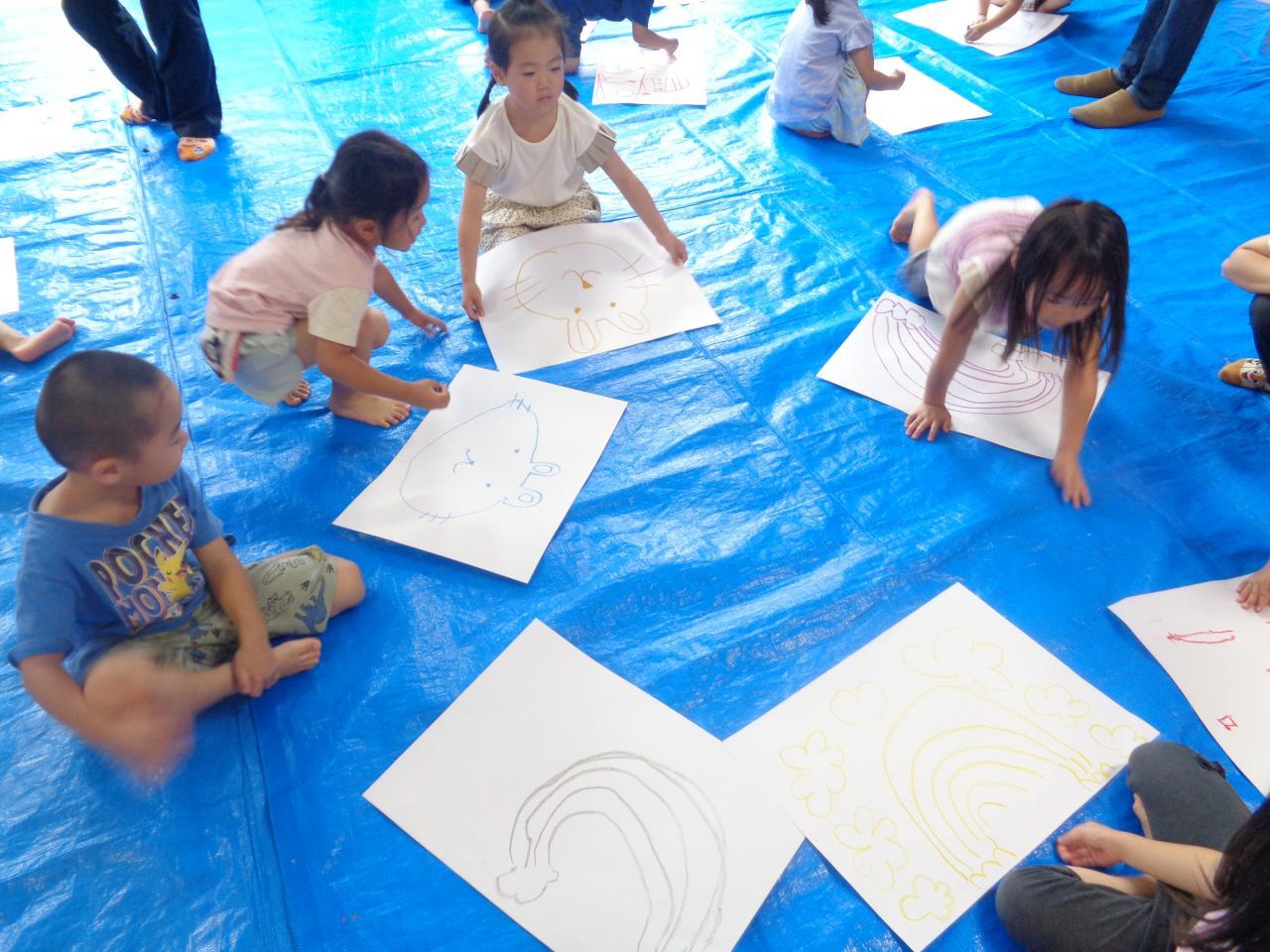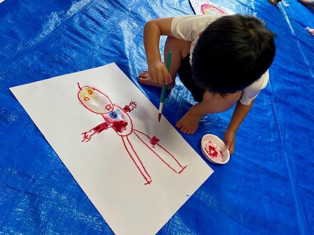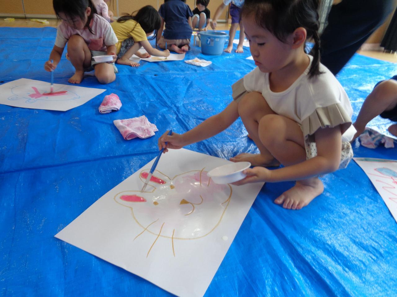 前日に考えた「描きたいもの」をクレパスで形取り、水彩で色付けします。白・赤・青・黄色の絵の具を使って、様々な色を混色して色の感覚を自然に身につけていくのが目標です。
