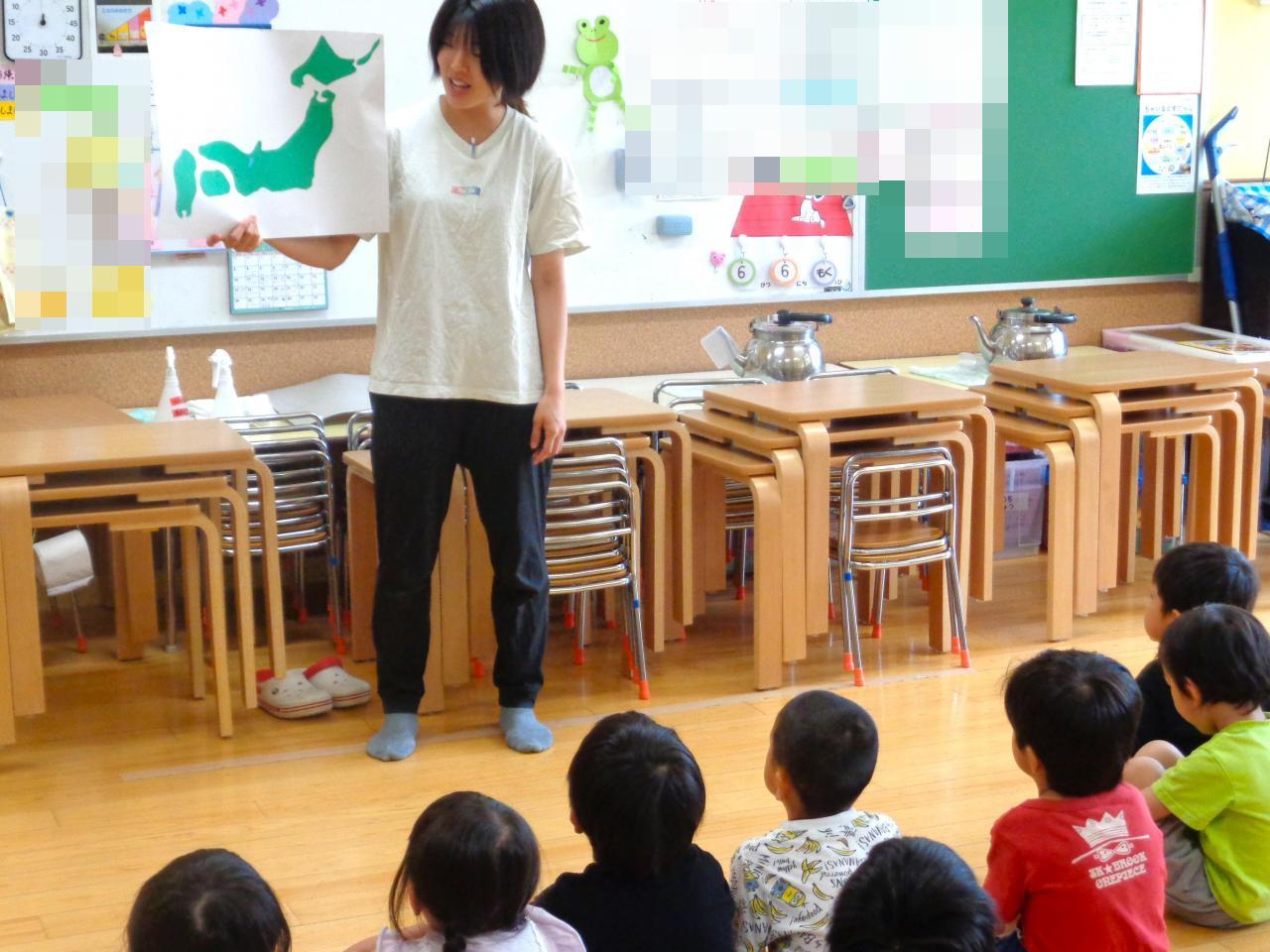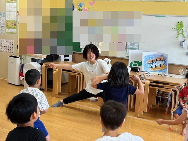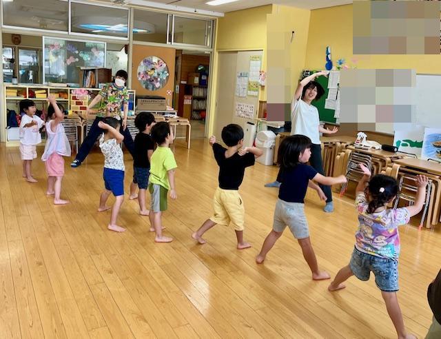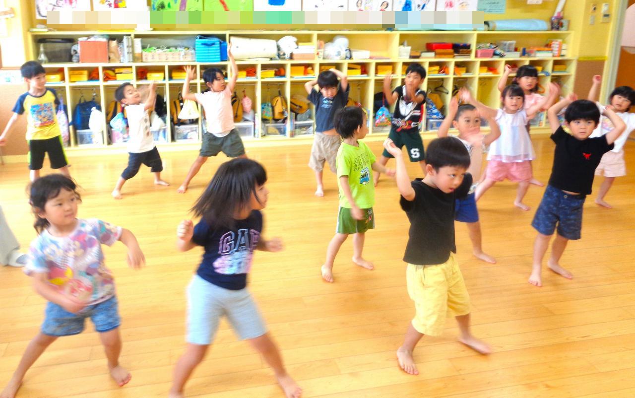「ソーラン節を一緒に踊ろう🤩」ソーラン節は北海道から来た音楽で魚を大網で捕る時にみんなで力を合わせて綱を引くときに歌う音楽だよ、と説明しました。『どっこいしょ~、どっこいしょ♪』『ソーラン、ソーラン』とノリノリでかけ声を口づさみ踊りを楽しんでいました👌