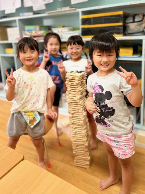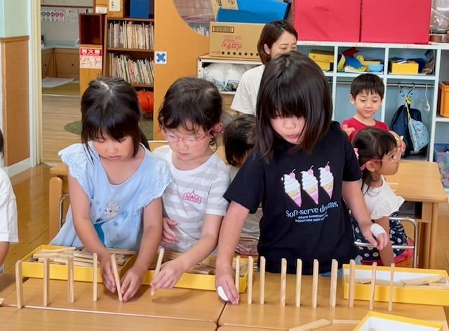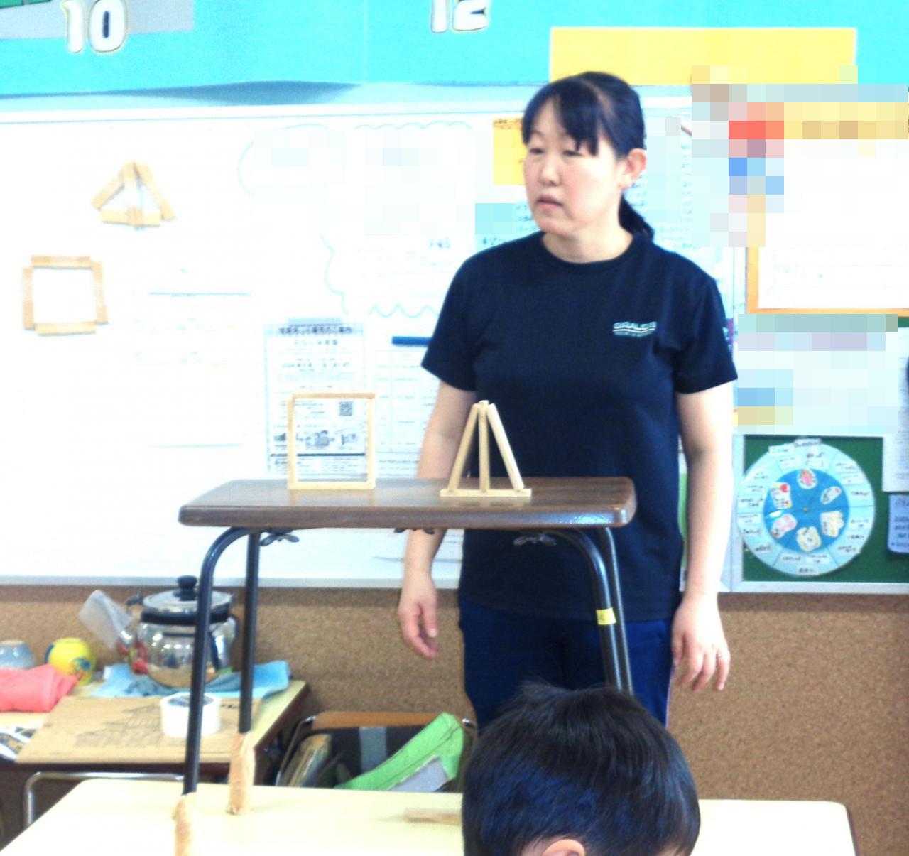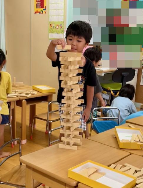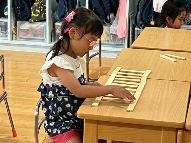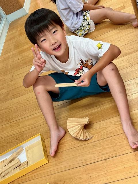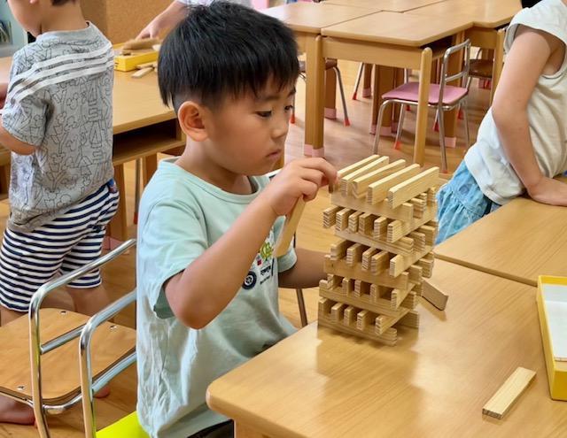 「カプラでいろいろな形を作ろう!」最初は△三角▢四角を机の上に平面に並べて作り、そこから△▢を立体的に作ってみました。次第にイメージが膨らみ、それぞれに形を作り楽しむ姿がみられました。