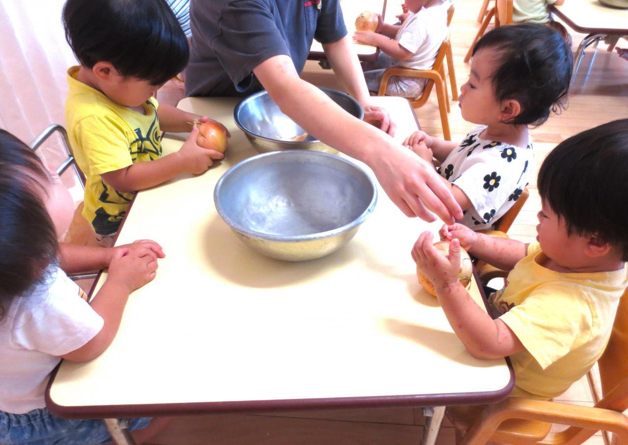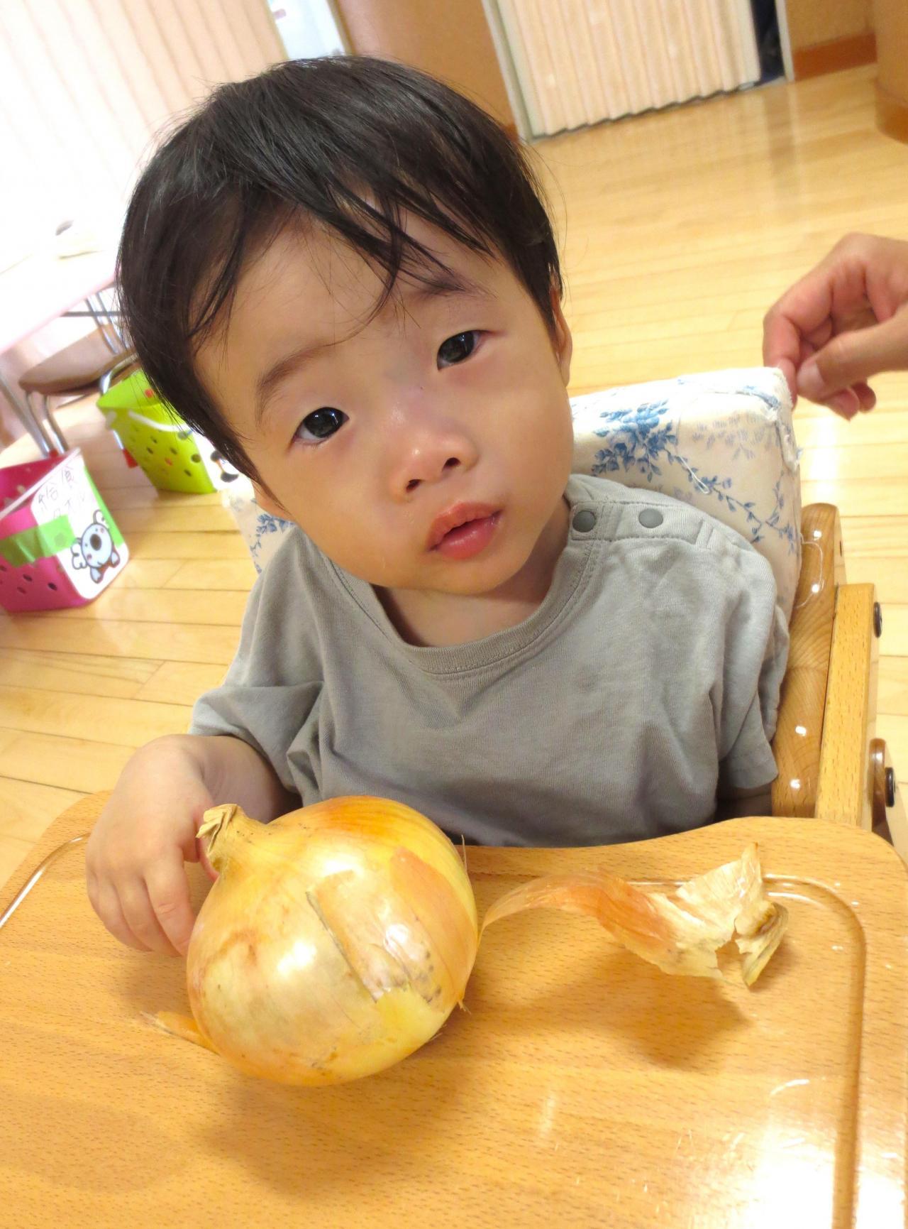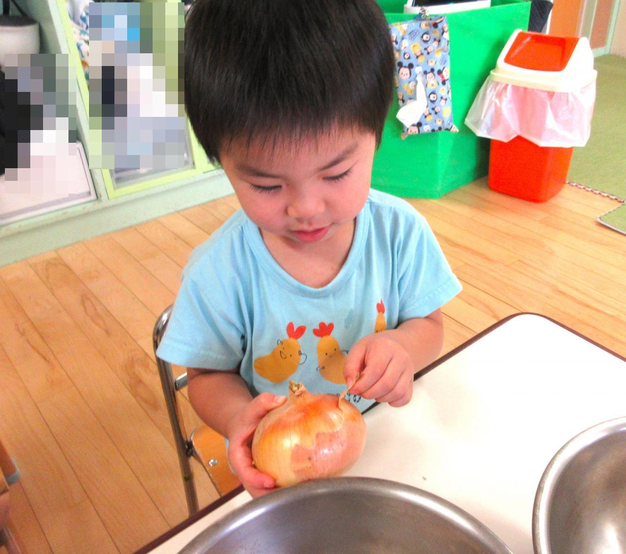 もも組・・・「玉ねぎの皮むき」今月は玉ねぎの皮むきに挑戦したもも組さん♪