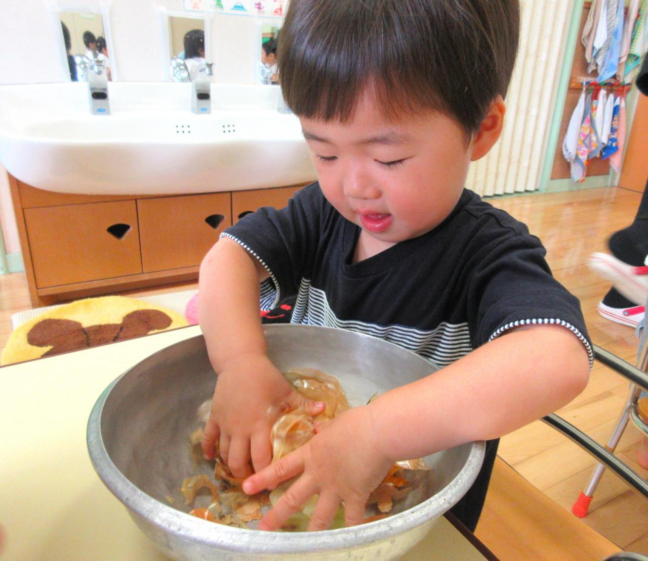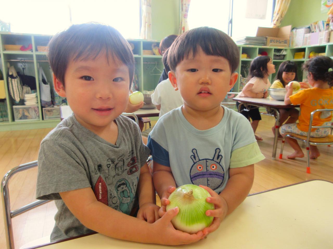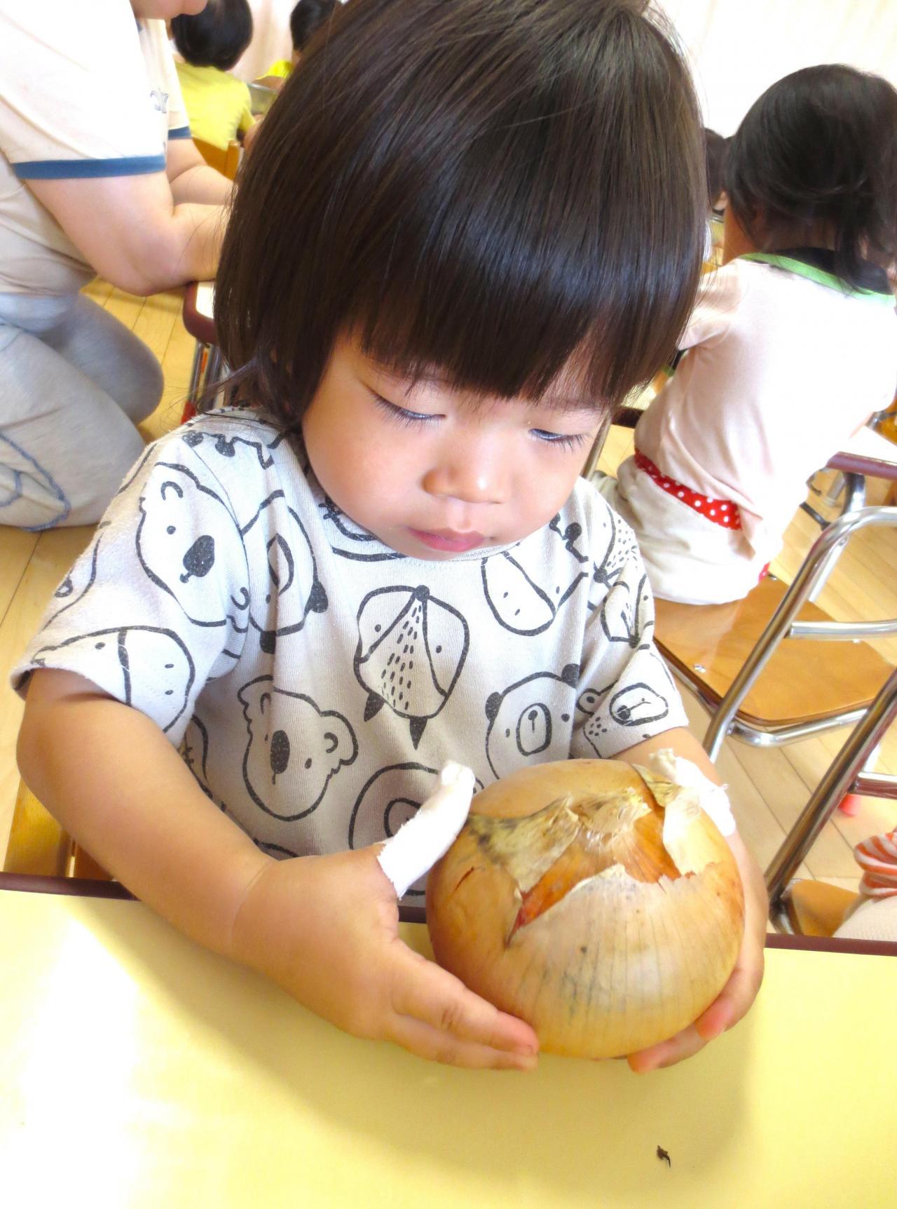 もも組・・・「玉ねぎの皮むき」今月は玉ねぎの皮むきに挑戦したもも組さん♪
