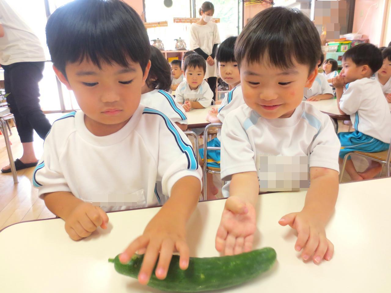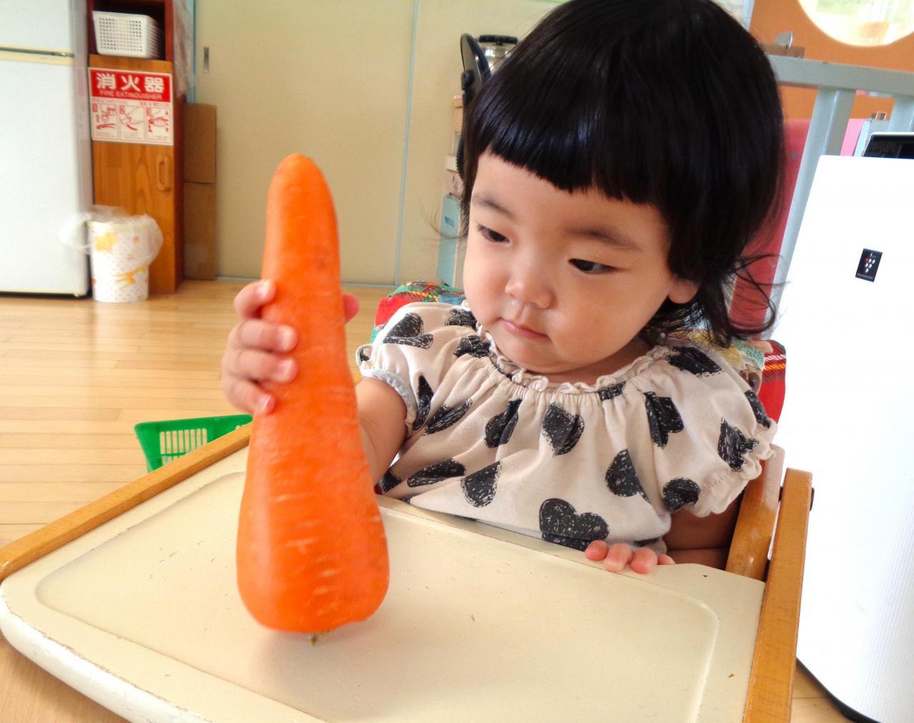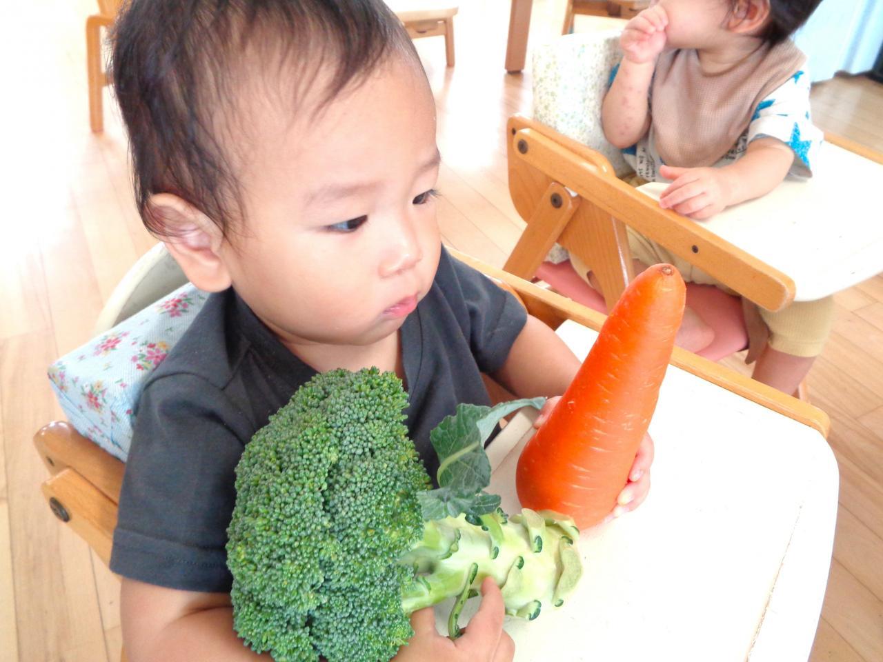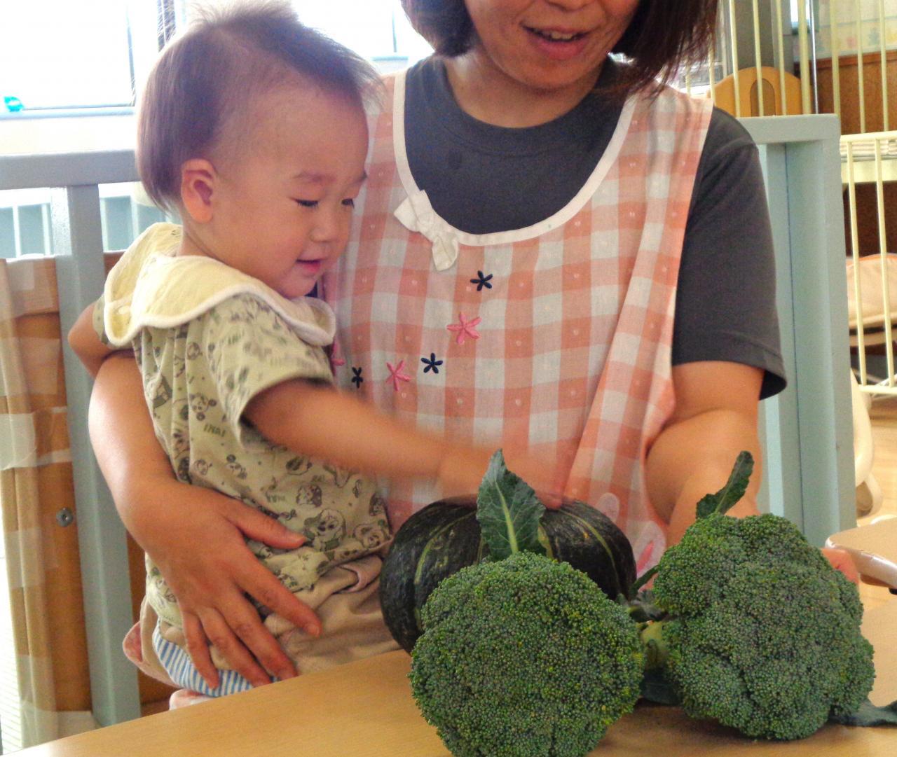 たんぽぽ組・・・さつまいも🍠、かぼちゃ、にんじん🥕、ブロッコリー、小松菜を触りました。大きなお野菜にびっくりの子どもたち!恐る恐る触る子や、まだ触っていたい♡と大事に握りしめている子もいました。