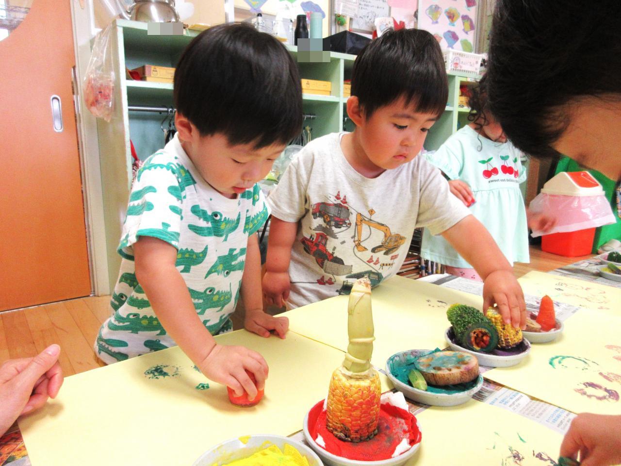さくら組・・・暑い夏も元気いっぱいのさくら組さん。絵の具遊びや、室内でゲームなど身体もしっかり動かして過ごしました。