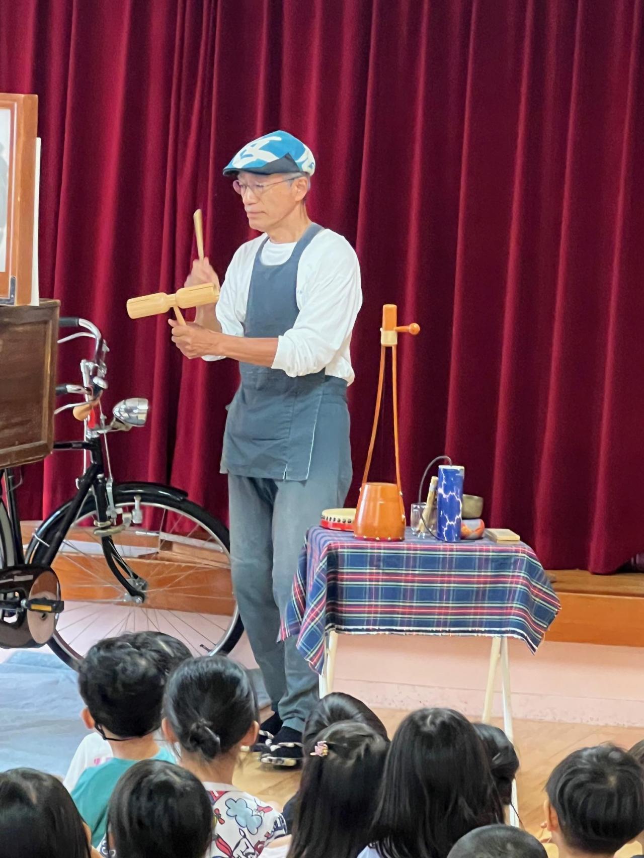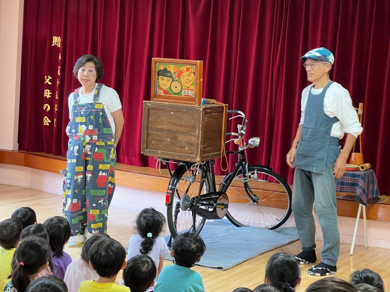 紙芝居屋さん『ゆめやしょうてん』の「きらくさん」右側 「のんきさん」左側