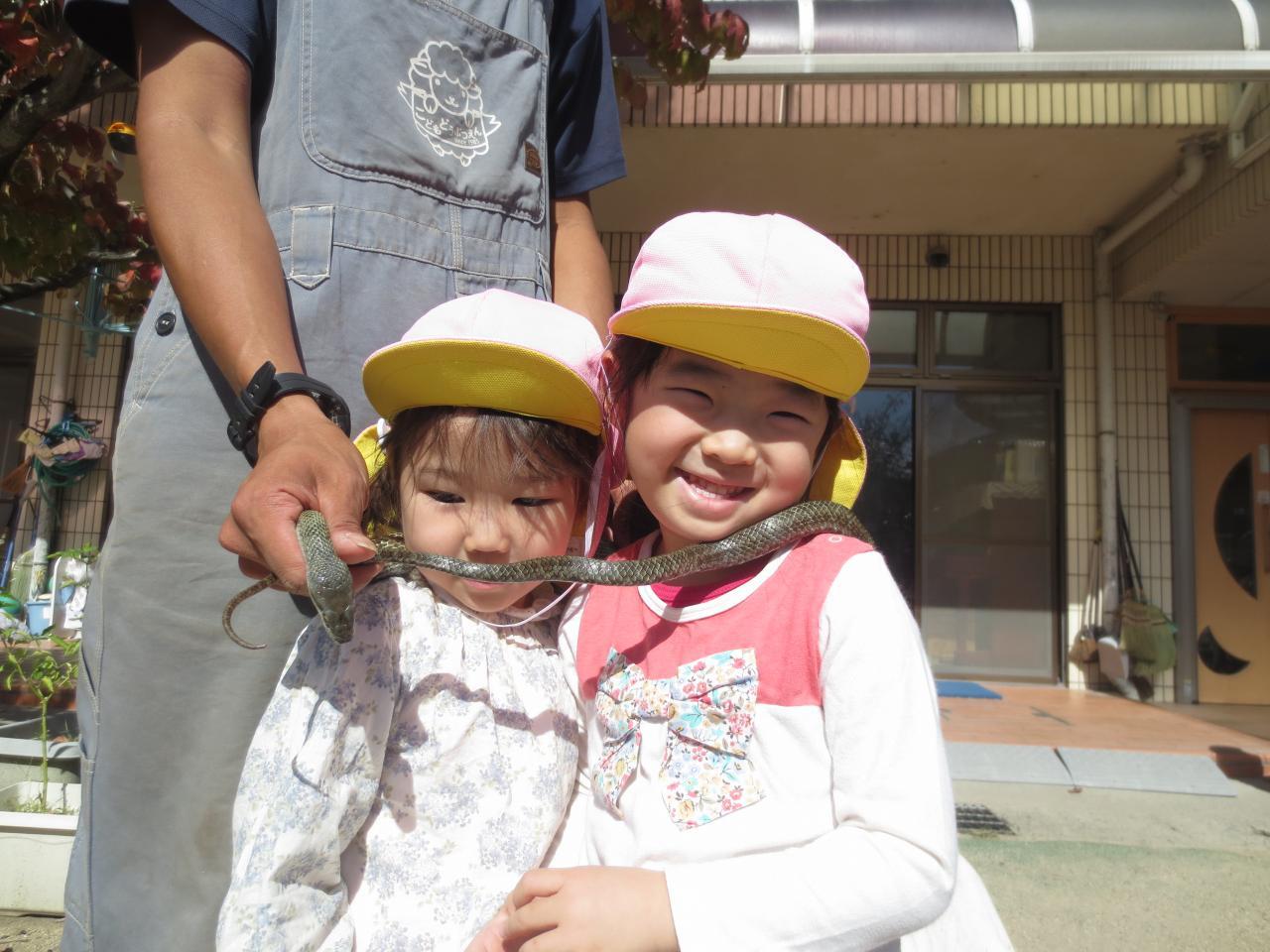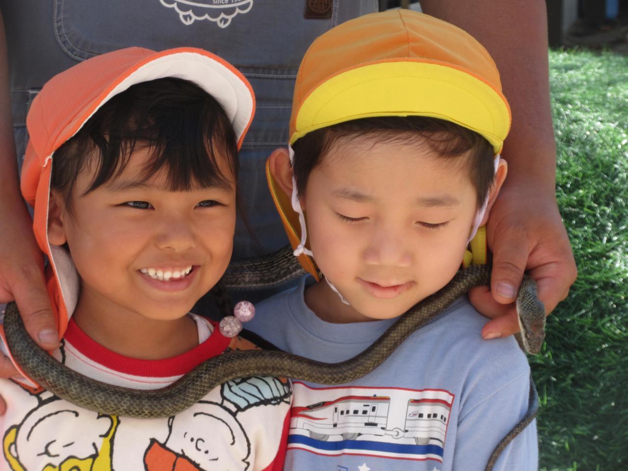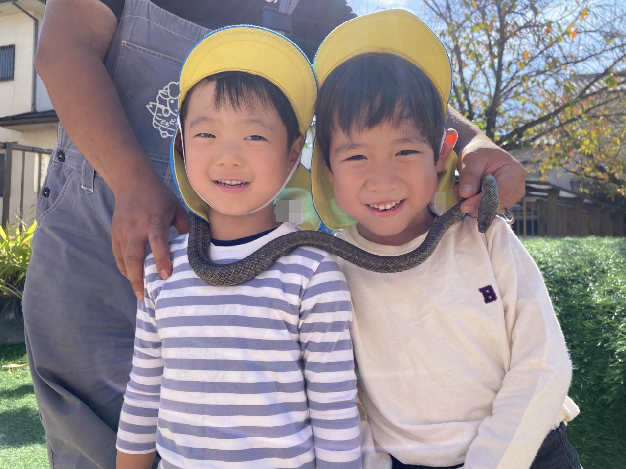 毎年恒例のヘビ巻きを楽しみにしていました❗勢い良く立候補してくれましたが、いざとなるとドキドキしていましたよ😄