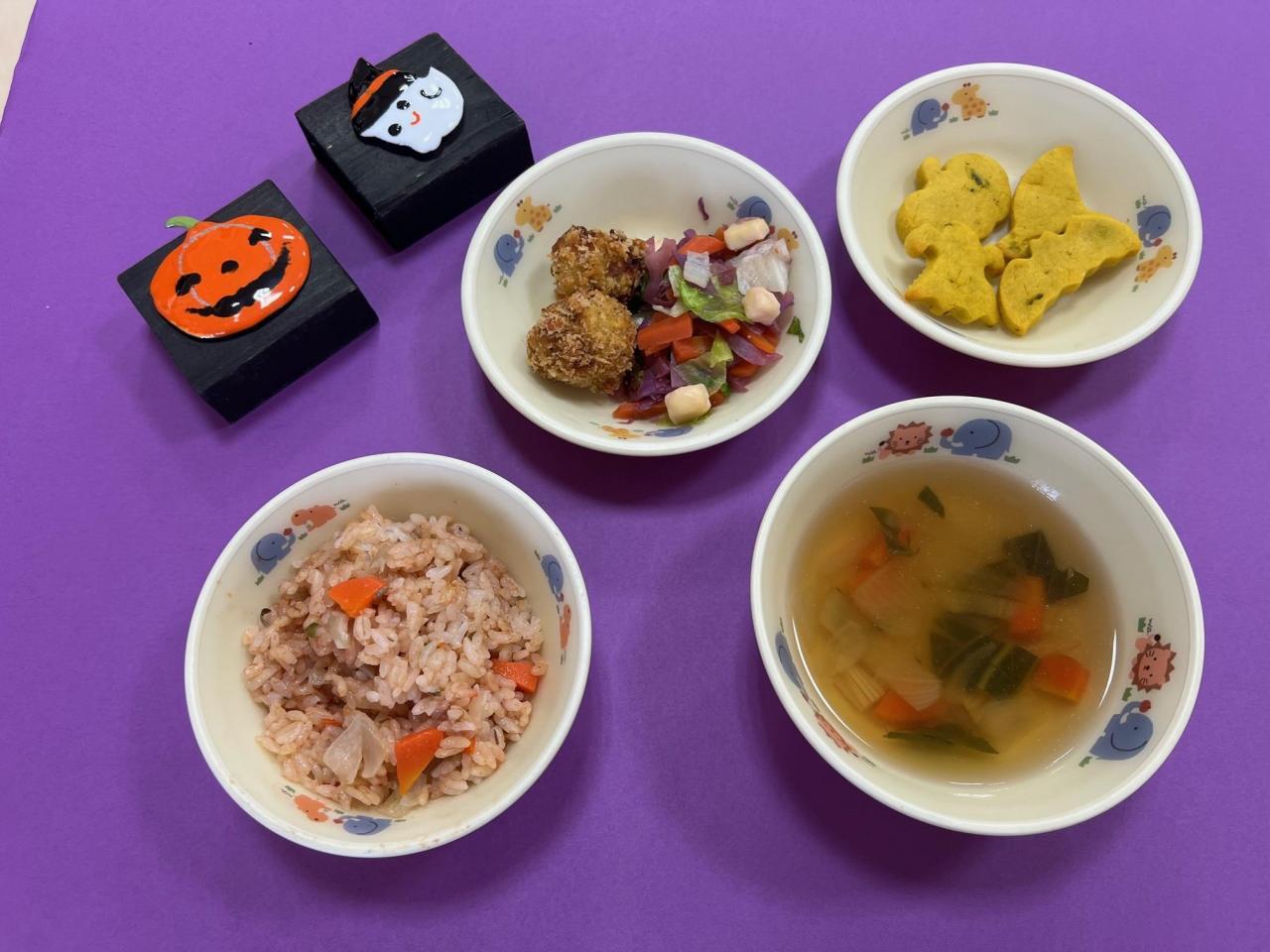 【ハロウィンメニュー🎃】ケチャップライス・南瓜コロッケ/ハロウィンサラダ・洋風スープ