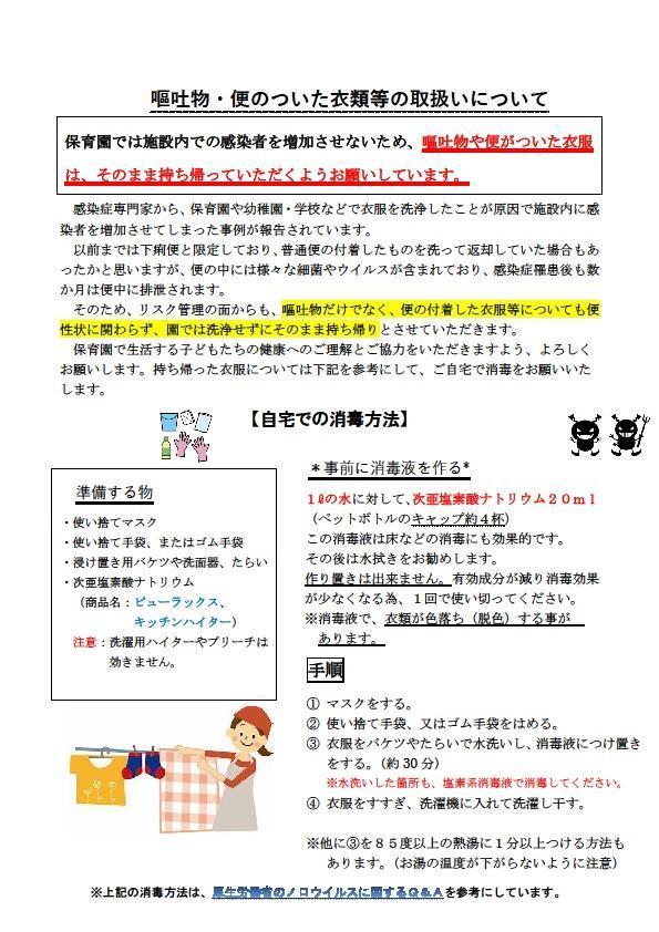 これまで、保育園内での感染拡大防止のため、嘔吐物や下痢便の付着した衣服については、そのまま返却させていただき、ご家庭での消毒をお願いしておりました。(入園の手引きもそのように記載しています)