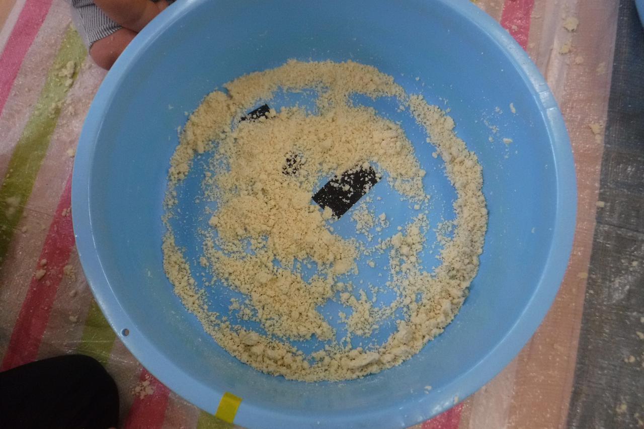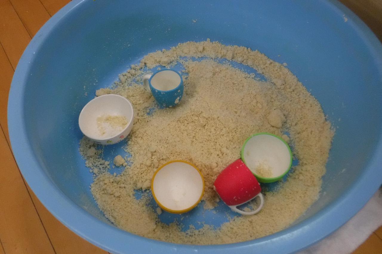 最初はサラサラの状態のおからパウダーの感触を楽しみ、その後徐々に水を加えて、こねていきます✨