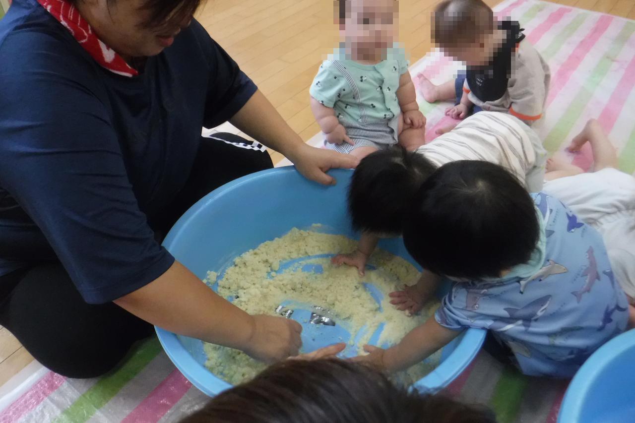 まだまだ暑い時期が続きそうですので、水遊びだけでなく、屋内やテラスを使って、様々な感触遊びをこれからも、子どもたちと一緒に楽しみます!