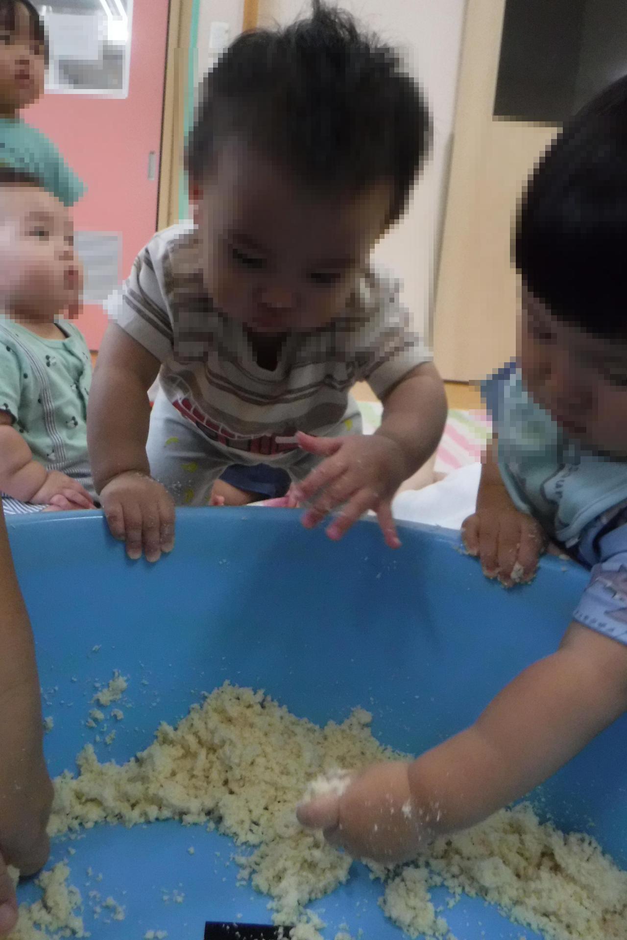 給食の場面だけでなく、普段の保育の中でも、感触遊びとして様々な素材に触れる経験をこれからもたくさんしていきたいと思います。