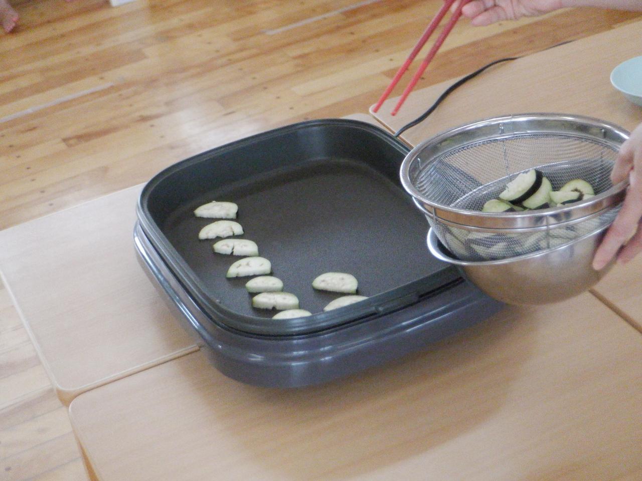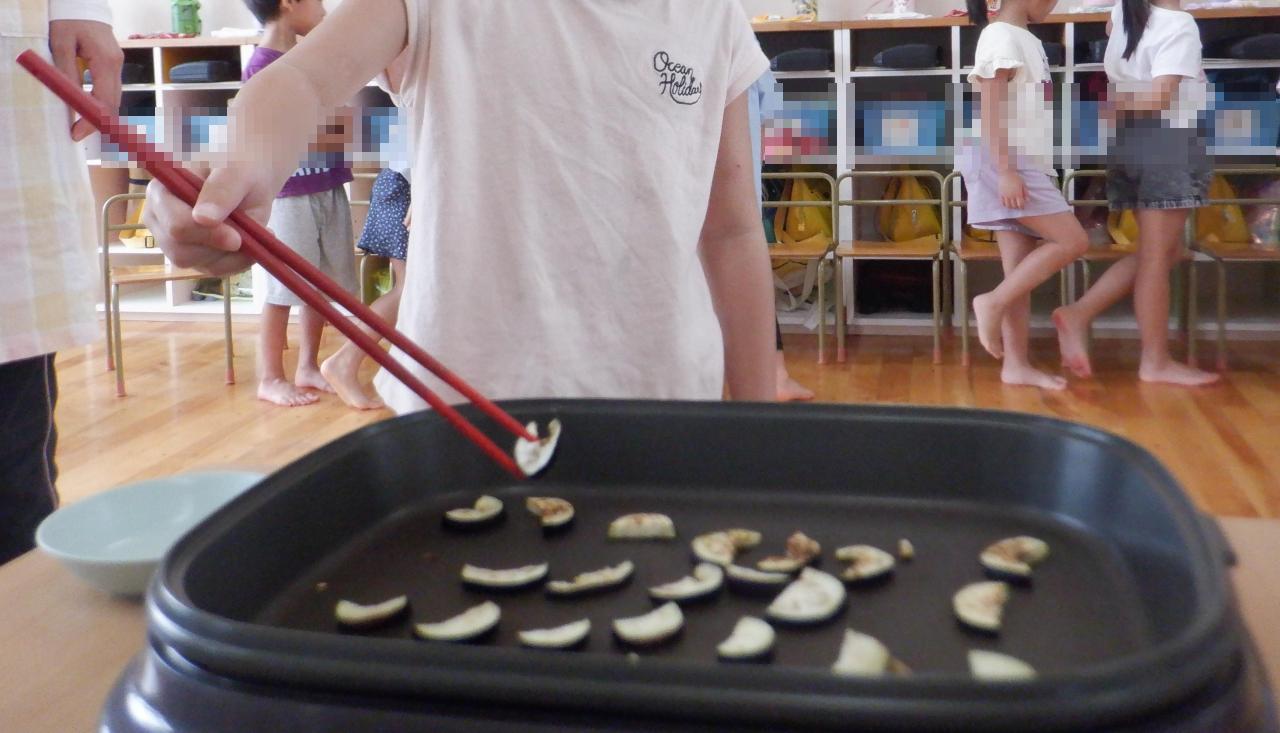 ひまわり組で育てている夏野菜のナスとピーマンを、今日はホットプレートで焼いて食べました😋✨