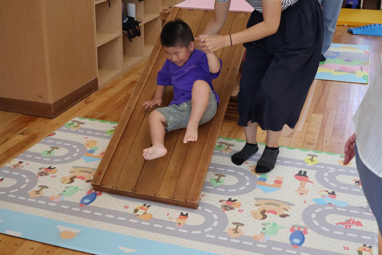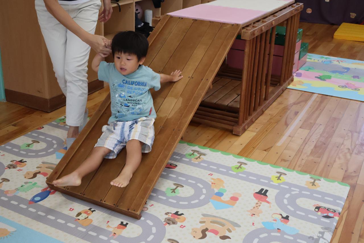 木でできた遊具でそれに登ったり、くぐったり、板を付けて滑り台にしたりして遊ぶものです。今日は足場も作って、滑り台にして遊びました。そこに登る力や、滑り降りるバランスなどが養われます。