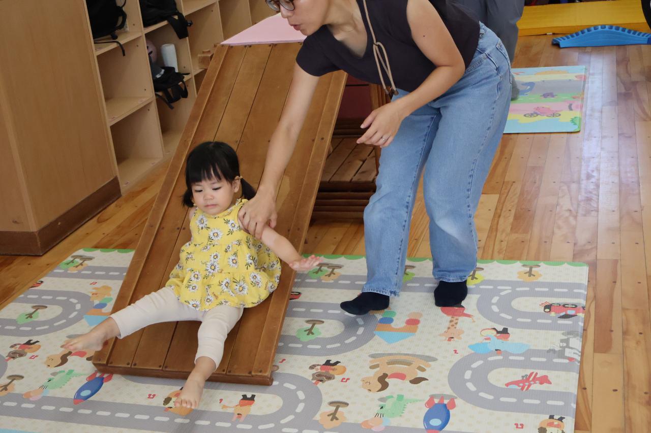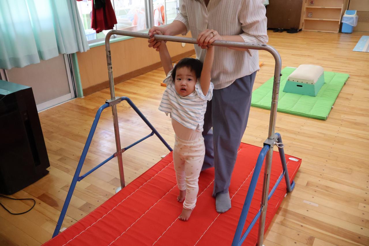 これも主に幼児クラスで使っている鉄棒です。今日は少し棒の高さを高めに設定し、ぶら下がる感覚を楽しみました。
