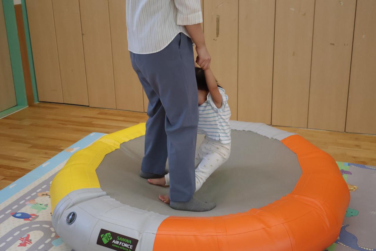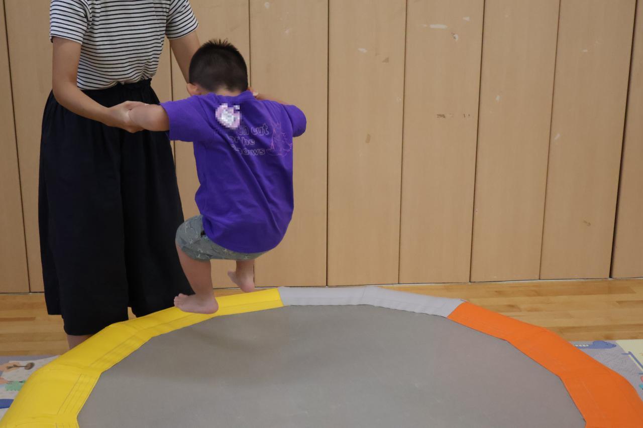 丸形のトランポリンを使って、そのうえでジャンプして遊びました。ジャンプするのは両足をタイミング良く力を掛けたりすることが必要になりますので、全身運動かつ足や腕等のバランス調整をする力も必要になります。普段のジャンプよりも高く飛べるのも楽しさの1つですね。