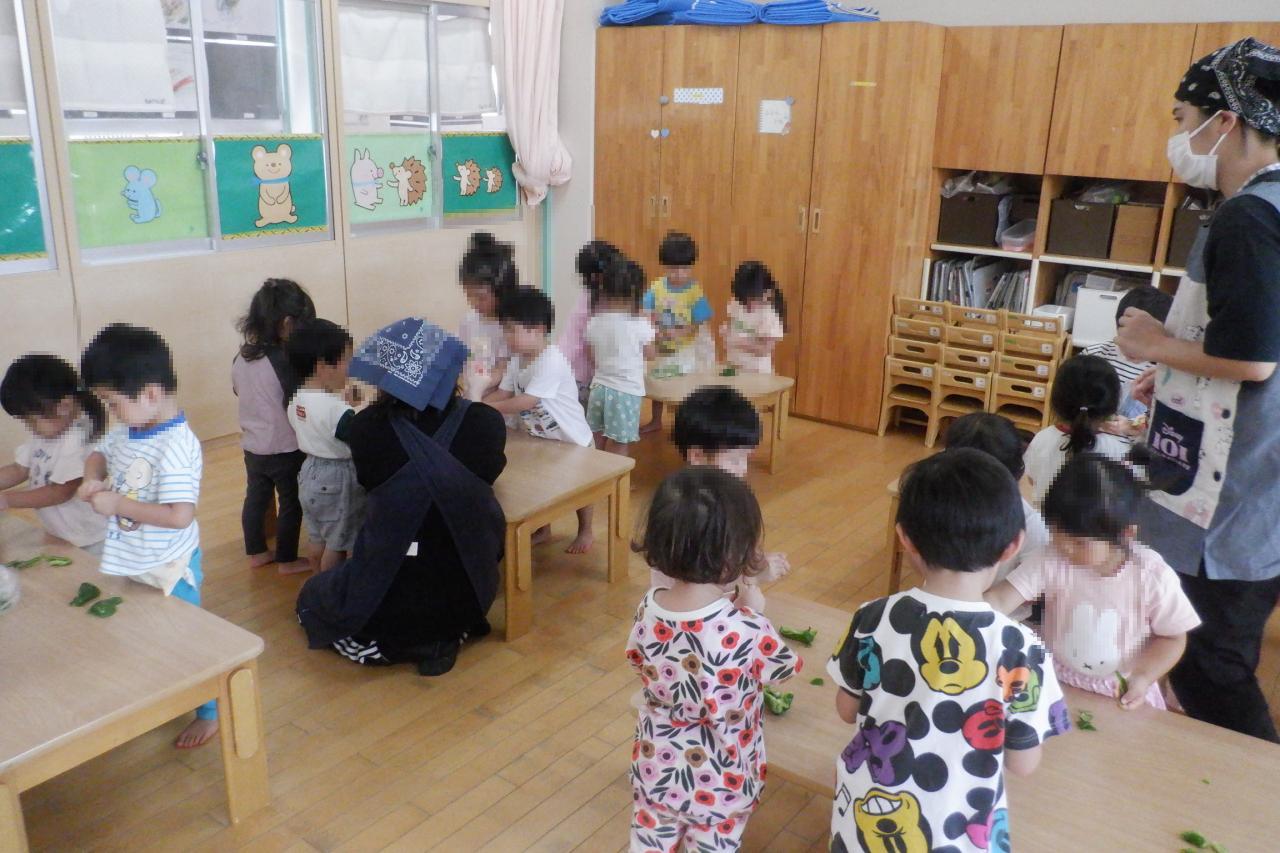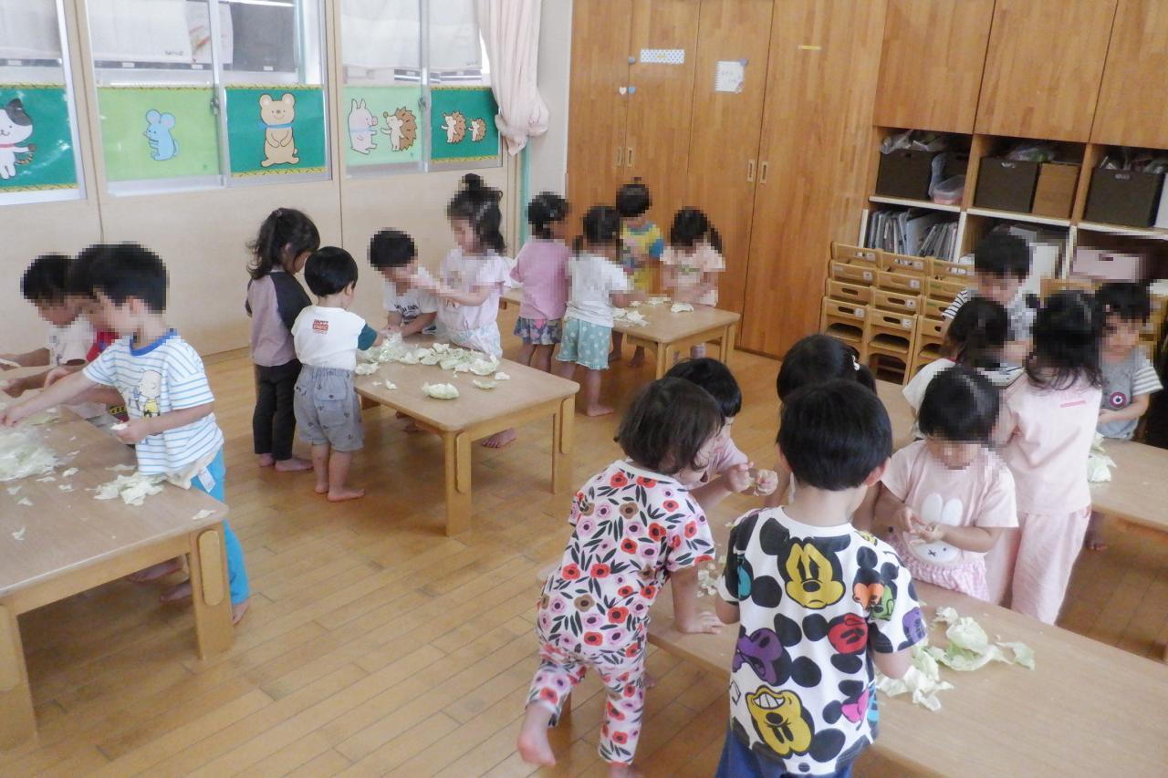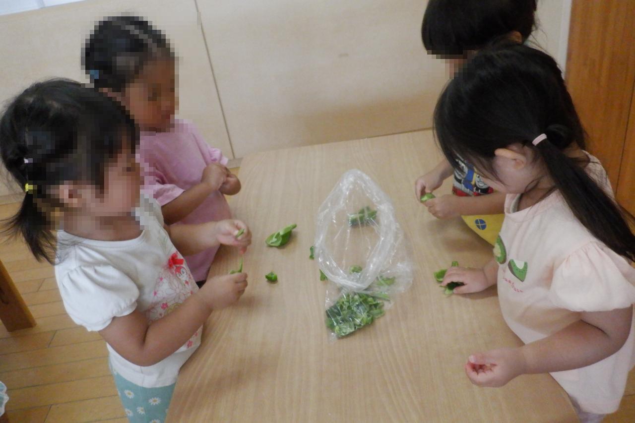 今日ちゅうりっぷ組では、調理手伝いとして、ピーマンとキャベツちぎりをしました!!