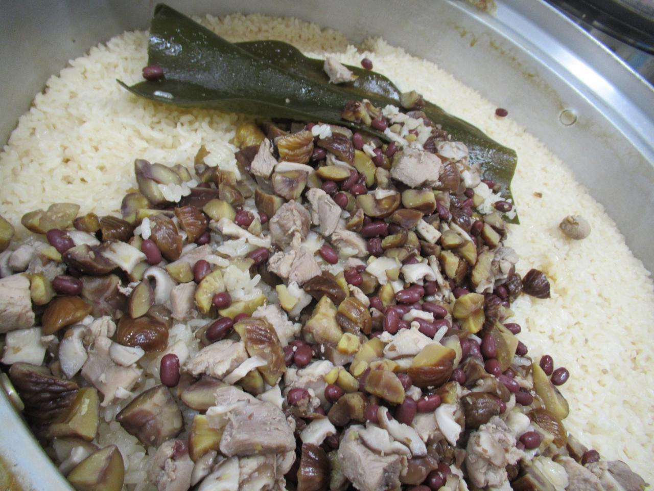 もち米と昆布と調味料を入れて炊いたご飯に煮込んだ具材を入れます。
