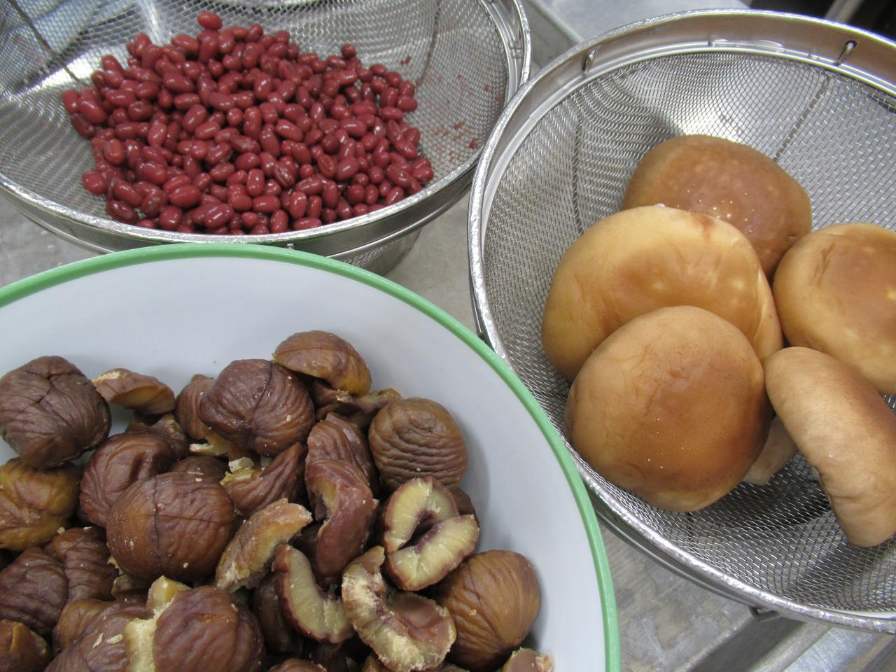 まず、鶏肉、しいたけ、栗、小豆を甘辛く煮ます🐔🍄🟫🌰🫘
