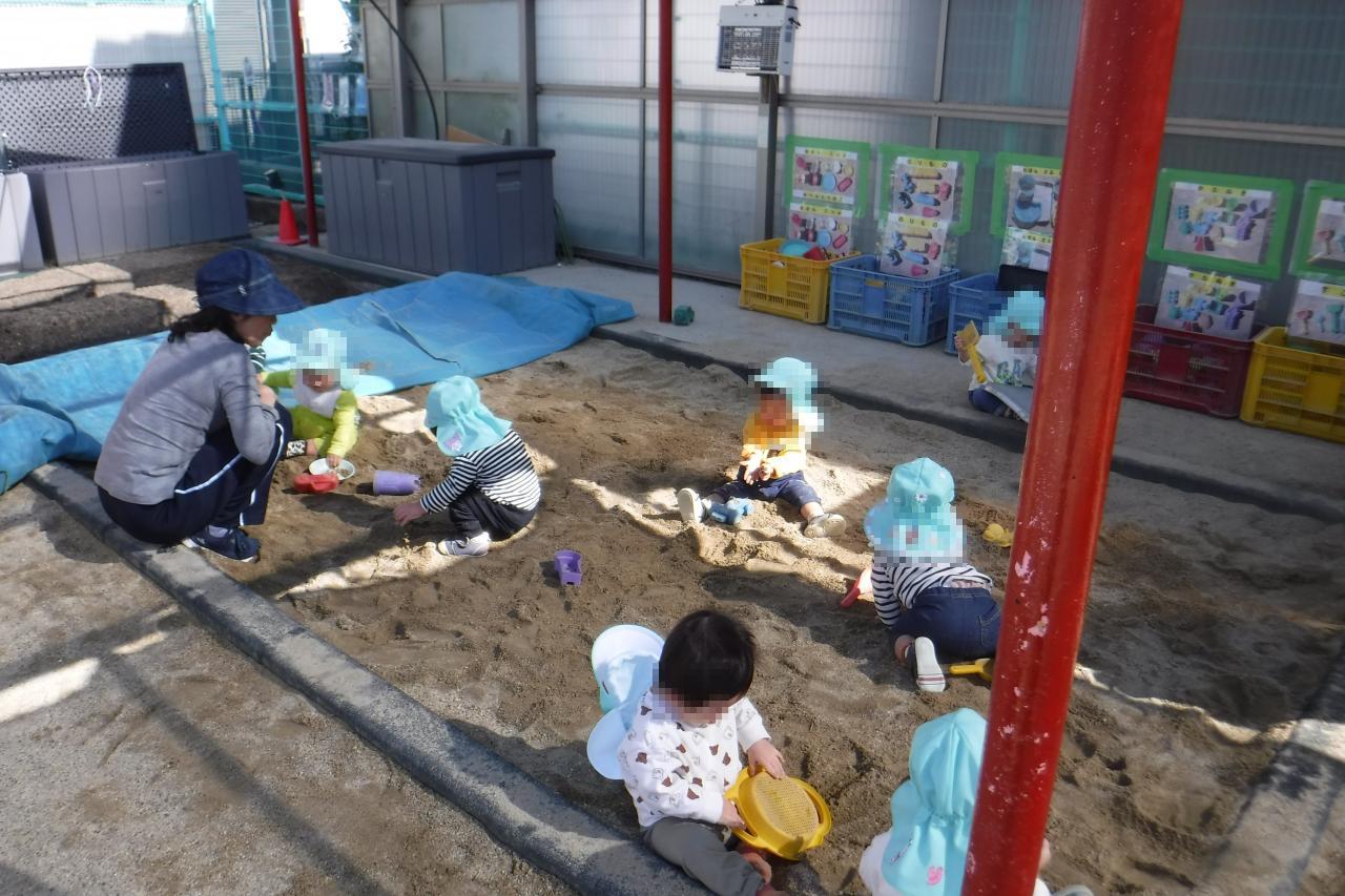 入園当初はなかなか自分たちで遊ぶのも難しかったすみれ組ですが、砂場で遊ぶことも慣れてきて、砂場のおもちゃで砂を救って遊んだり、ドームや芝生の山でもたくさん体を動かして遊んでいます😄✨