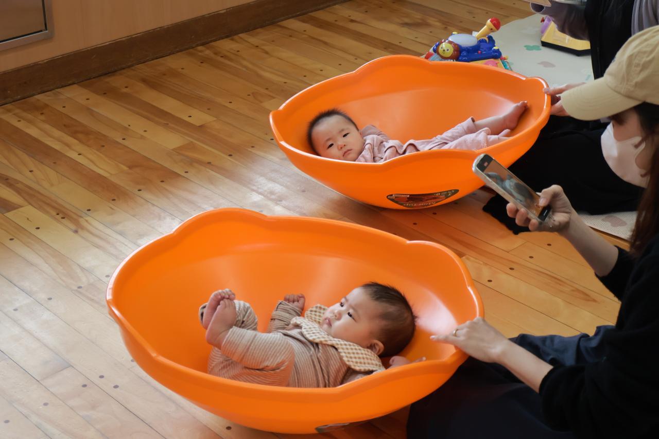 1つのコーナーで遊ぶ子や、遊戯室内をハイハイをして沢山動いて遊んだり、ミニトップの中に入って揺られるのを楽しんだりしました!