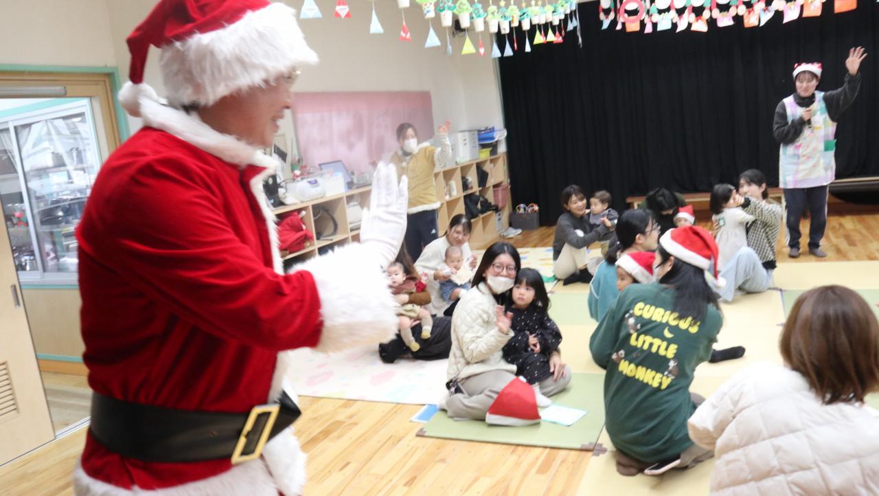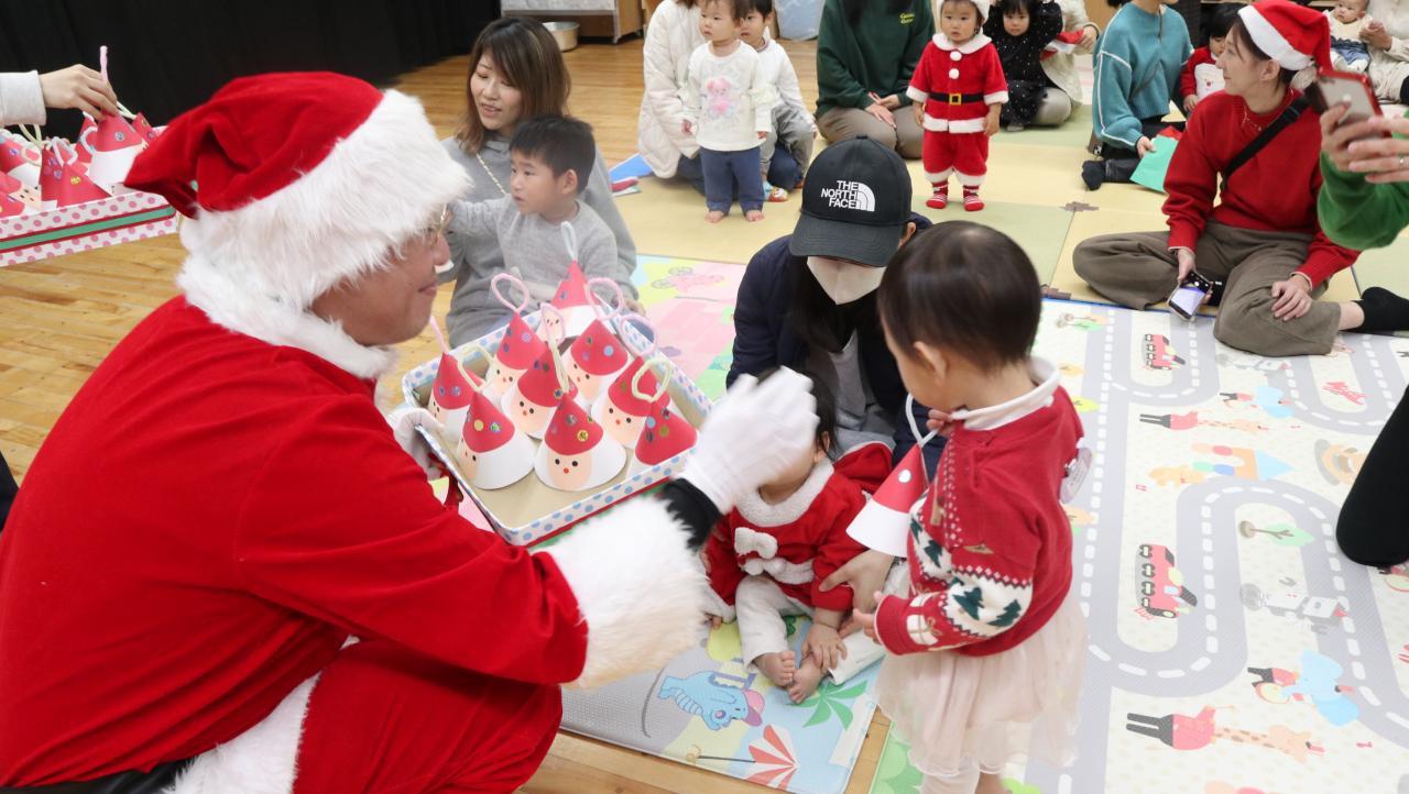 初めてサンタさんを見るお友達はちょっぴりドキドキ💕しながらも、