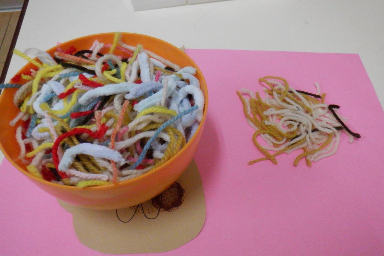 猫が遊ぶ毛糸玉を、画用紙に毛糸を貼り付けることで表現しました!