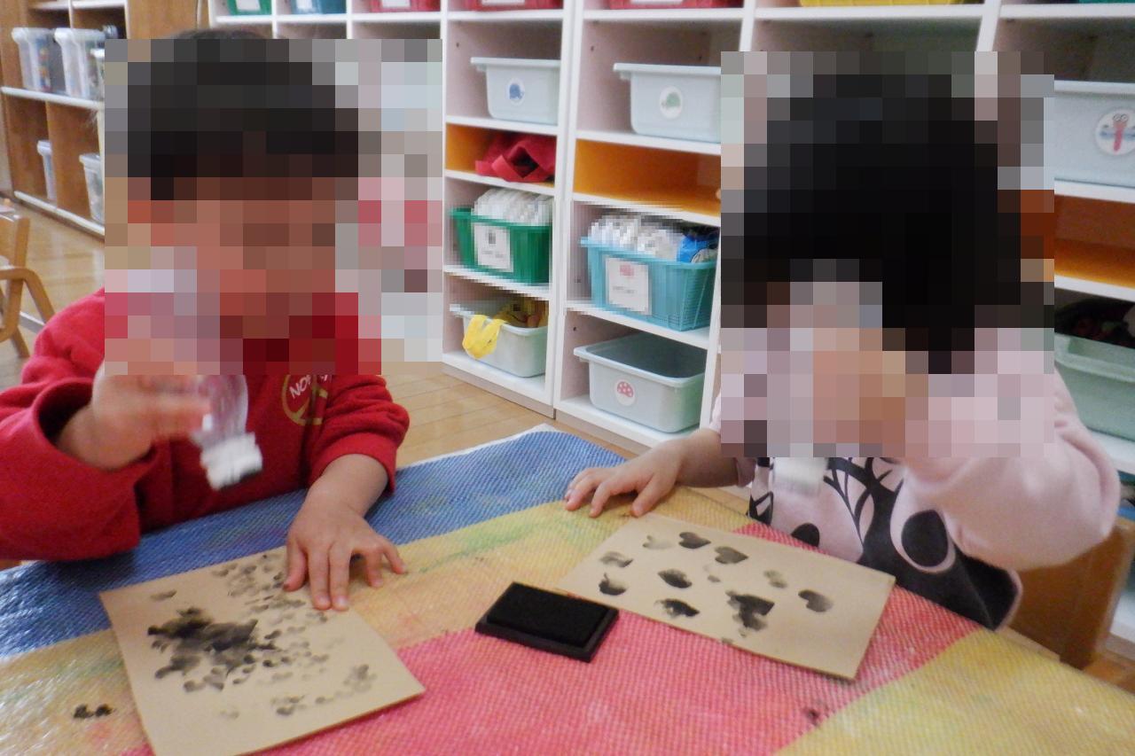 画用紙に模様がつく様子を楽しみながら、色や形に興味をもって取り組む姿が見られました☆