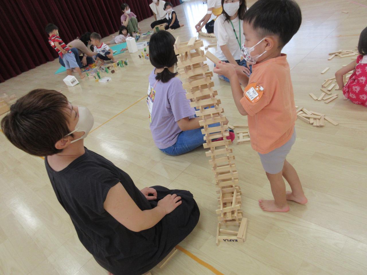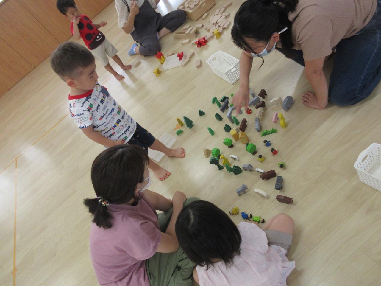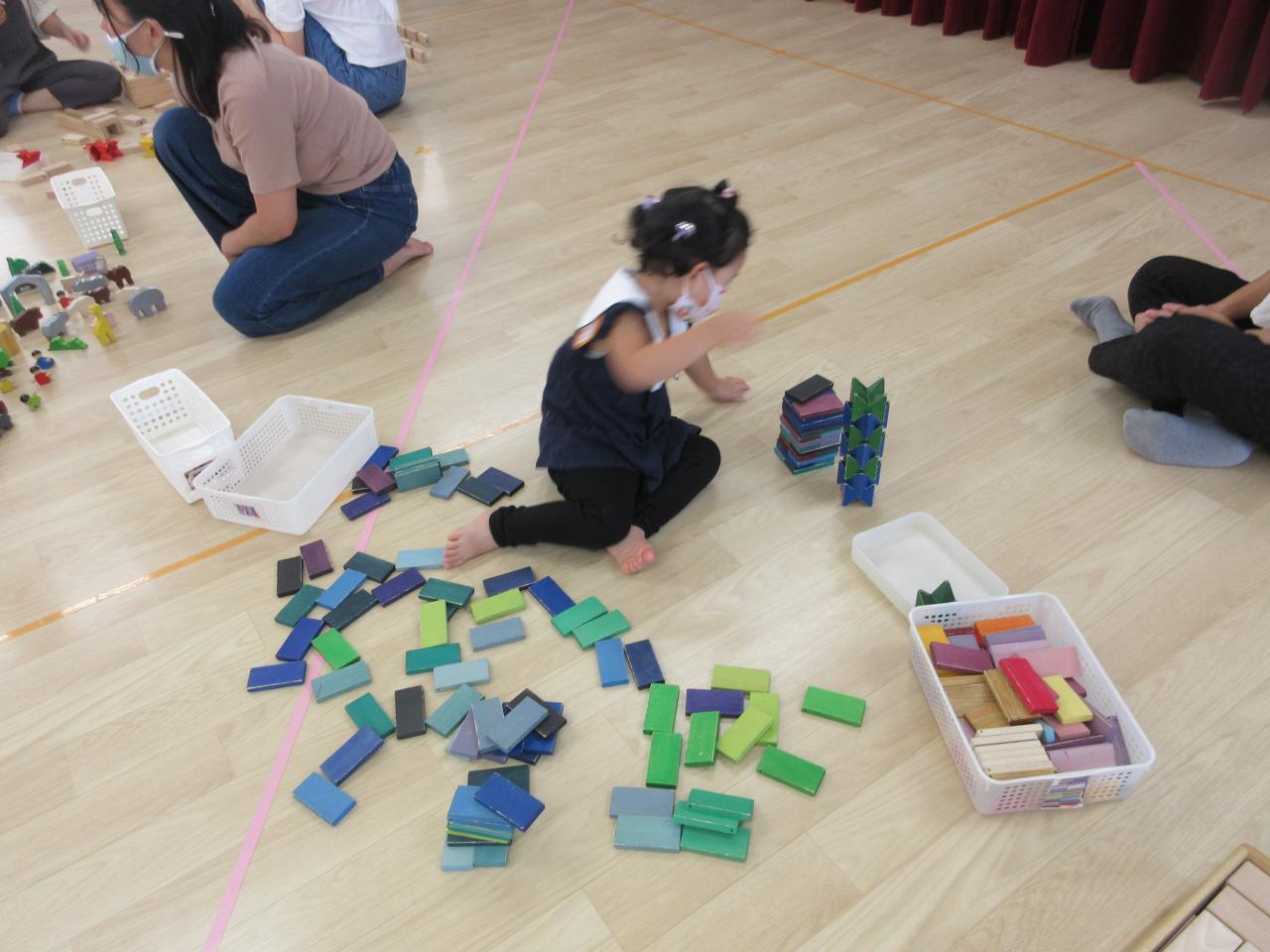 今回の内容は「積み木遊び」です。たくさんの積み木を用意して、広々とした空間で遊びました❗