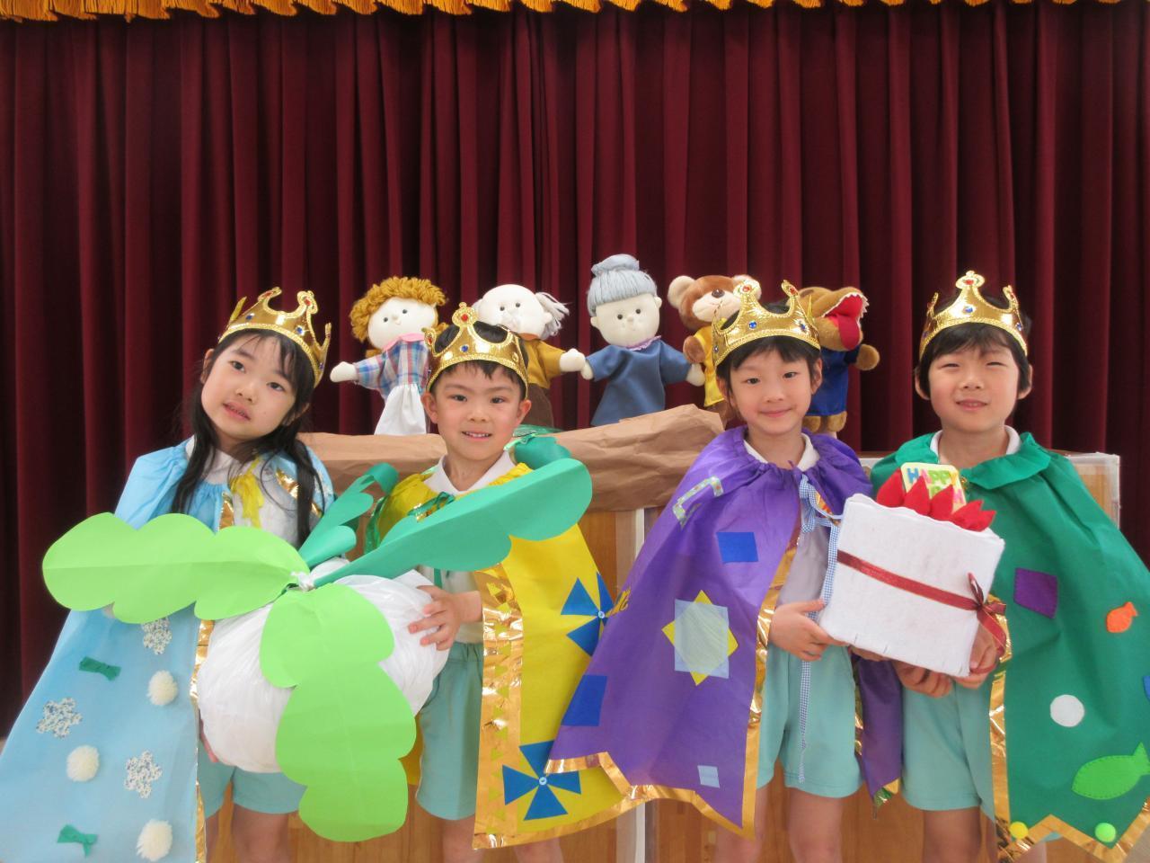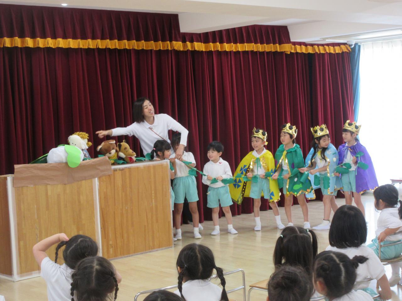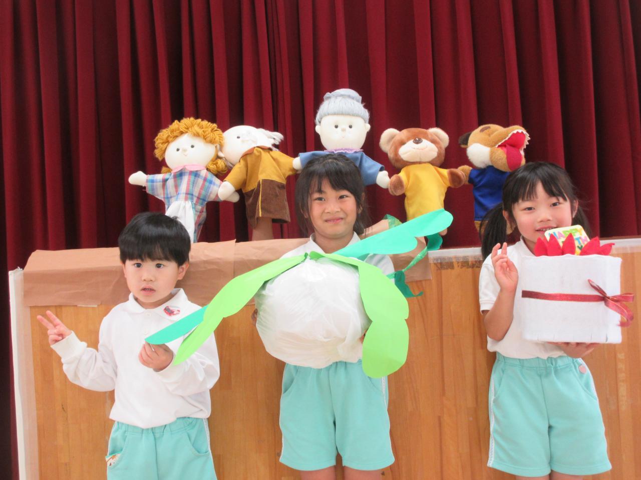 今回の先生からのプレゼントの出し物は、『おおきなかぶ』の人形劇です!!お話の最後には、5月生まれの誕生児も参加して、一緒にひっぱって・・・😄とても和やかな誕生会となりました🎁