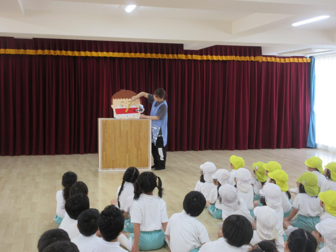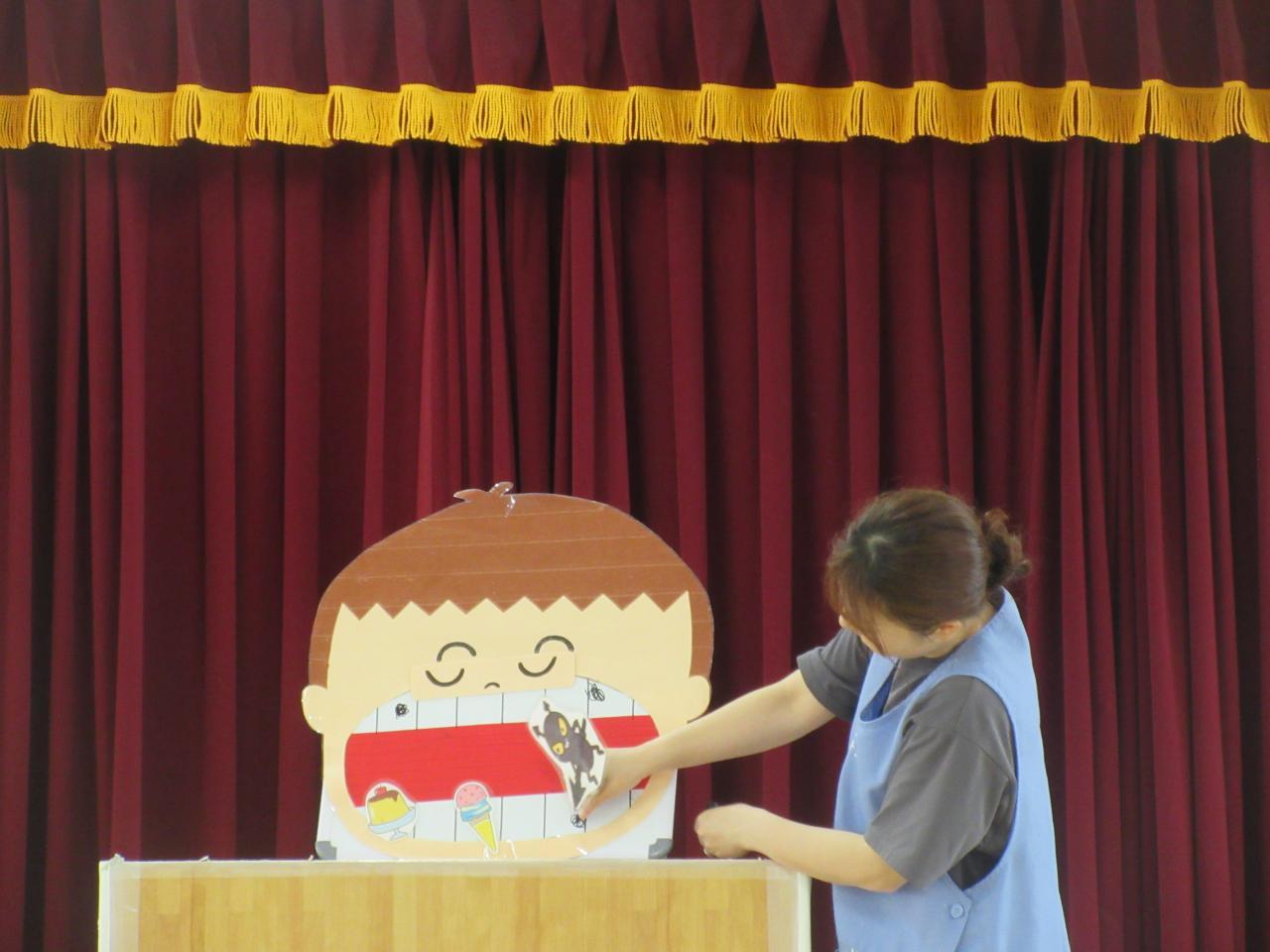 午前中、幼児クラスはお遊戯室で集まり、保育園の看護師の先生から、『歯』についてのお話がありました🙂