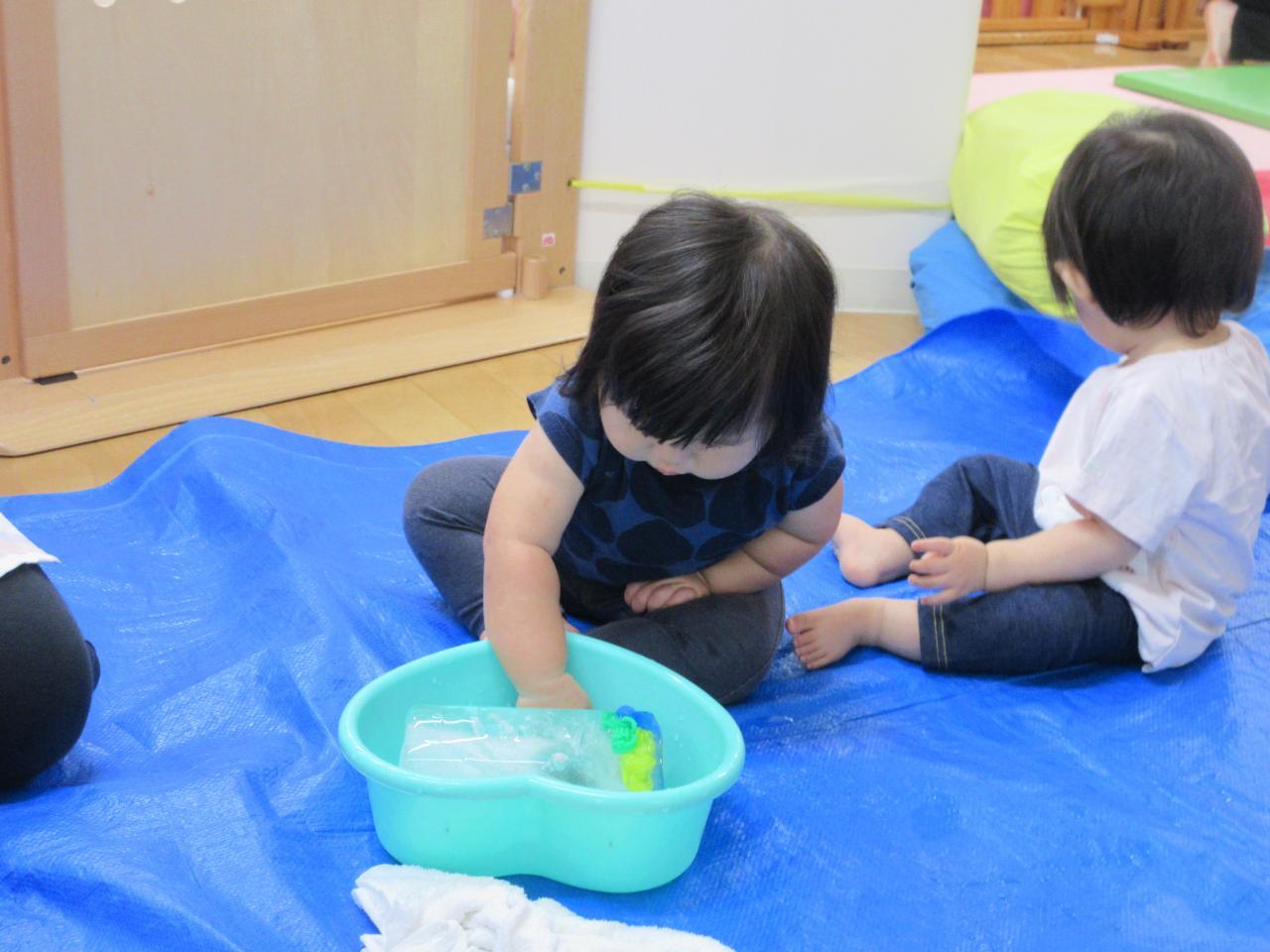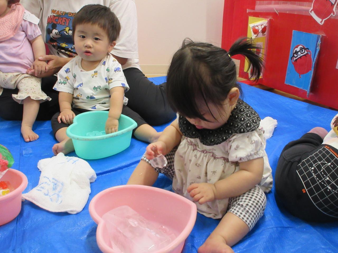 保育者が氷を出して、「おいで~」と声をかけると、「何だろう?」と不思議そうな表情をしていた子どもたち。