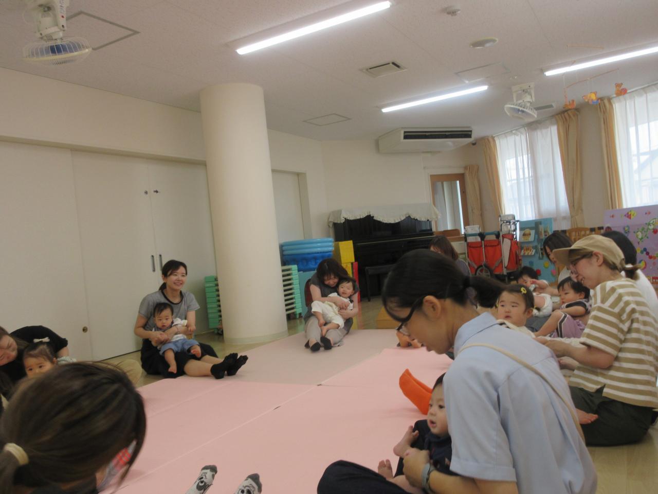 お母さんのお膝に座ってのスキンシップ遊びは、ニコニコの可愛い笑顔がみられ、ほっこりとした時間でした🍀