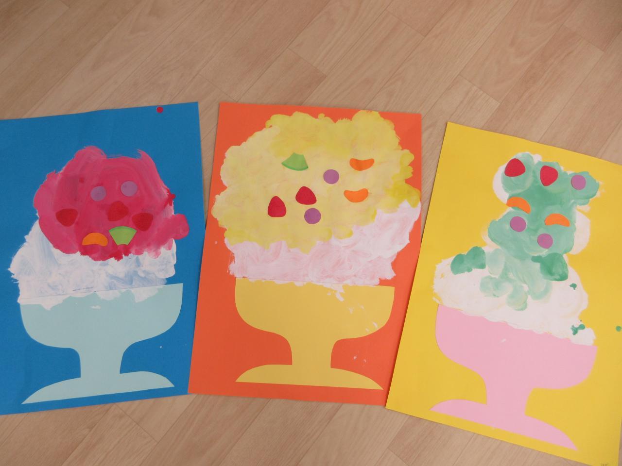 3歳児クラスでは、絵画で夏にぴったり、冷たくておいしい「かき氷」を絵の具で描きました🎨🖌️