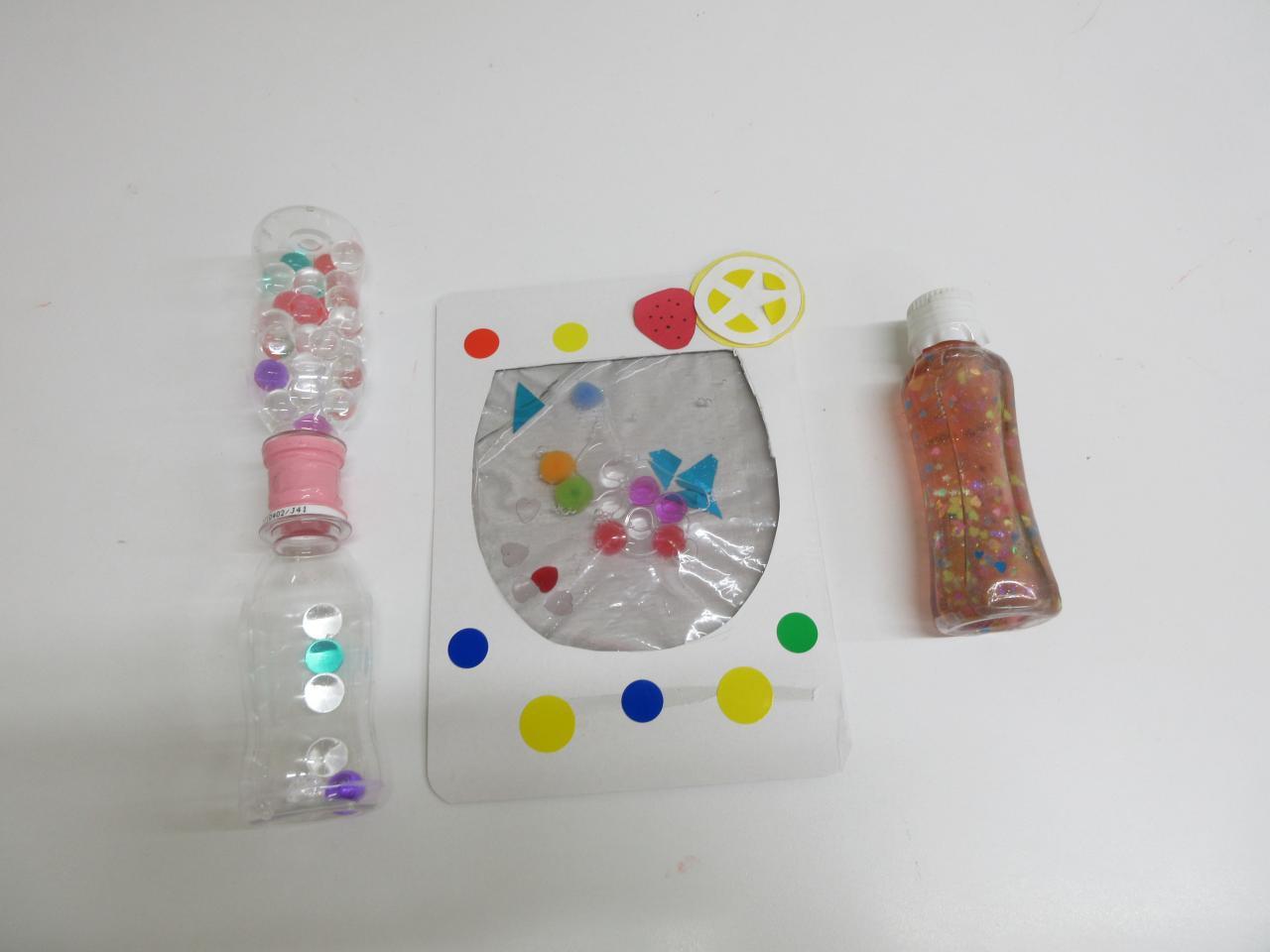 小さなジップロックの袋に、洗濯のりを入れ、その中にキラキラとした飾りや、カラフルな消臭ビーズ、手芸用のデコレーションボールなどを入れました。