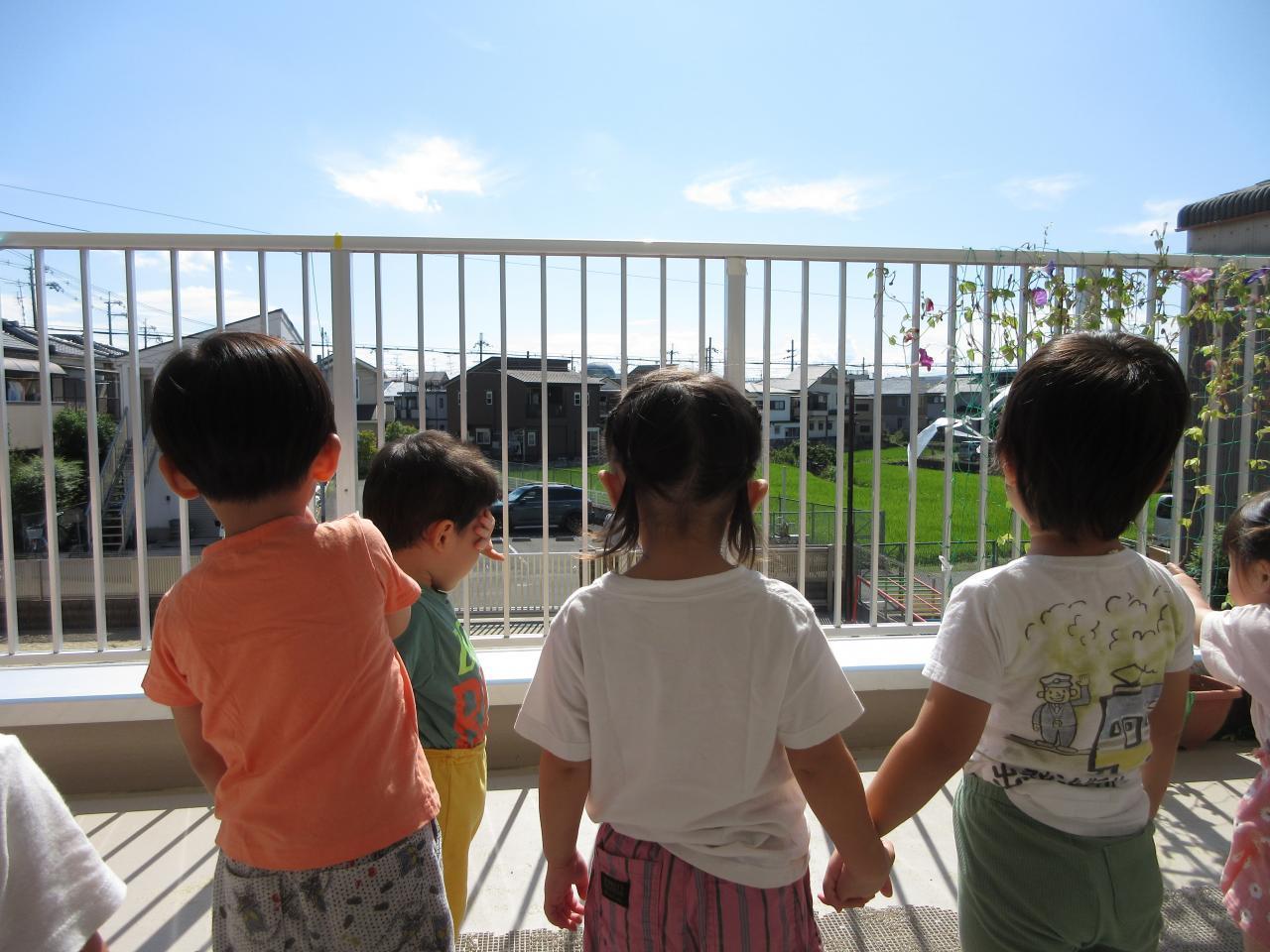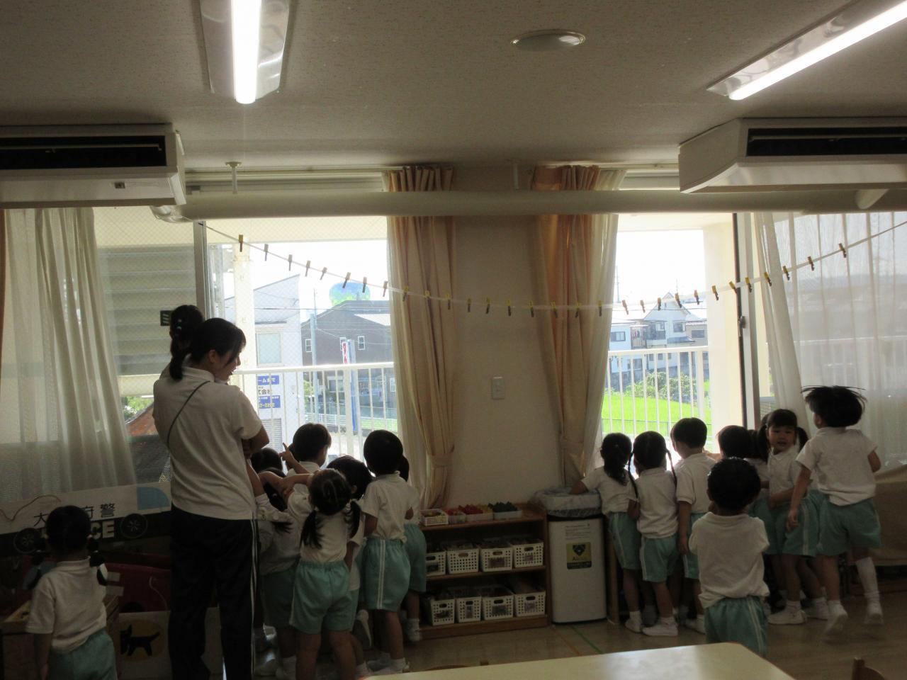 また、本日(9/12)、近隣の高校の行事で気球があがっていました!!子どもたちは「気球❔」という感じのお友だちもいましたが、実際に保育園のクラスの窓から気球が見えると、カラフルな色、大きな風船のような球体に子どもたちも興味津々で大はしゃぎでした!!