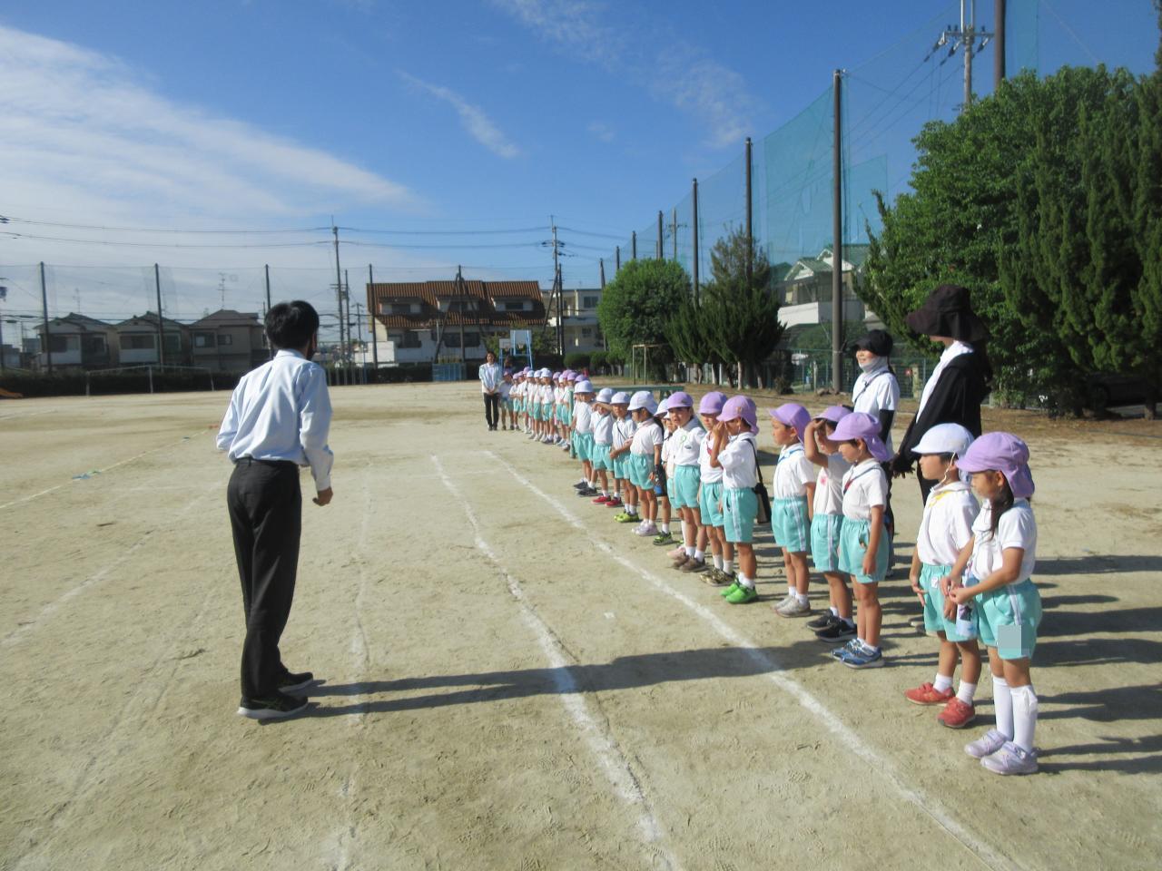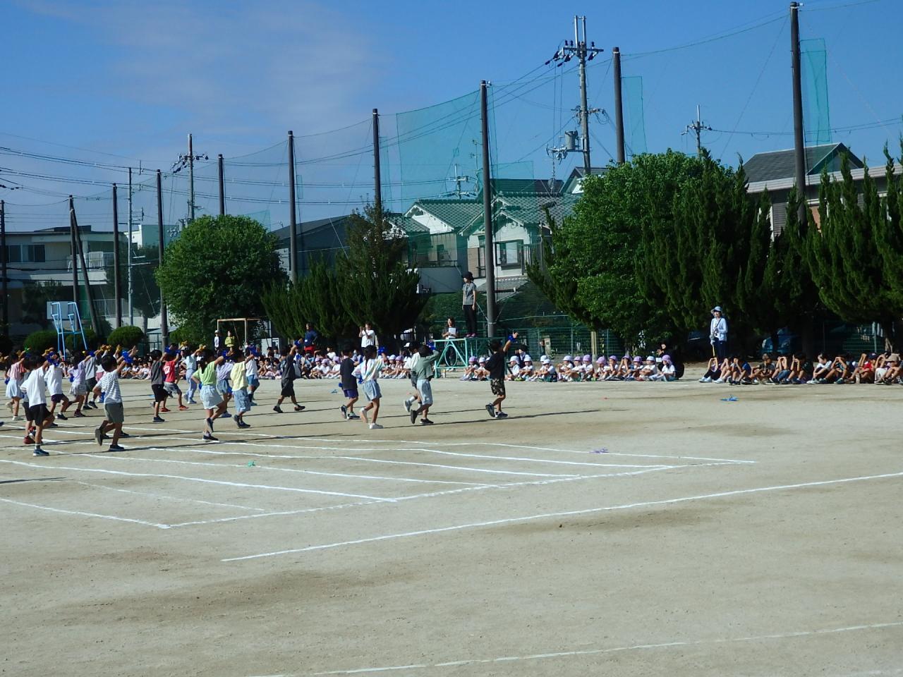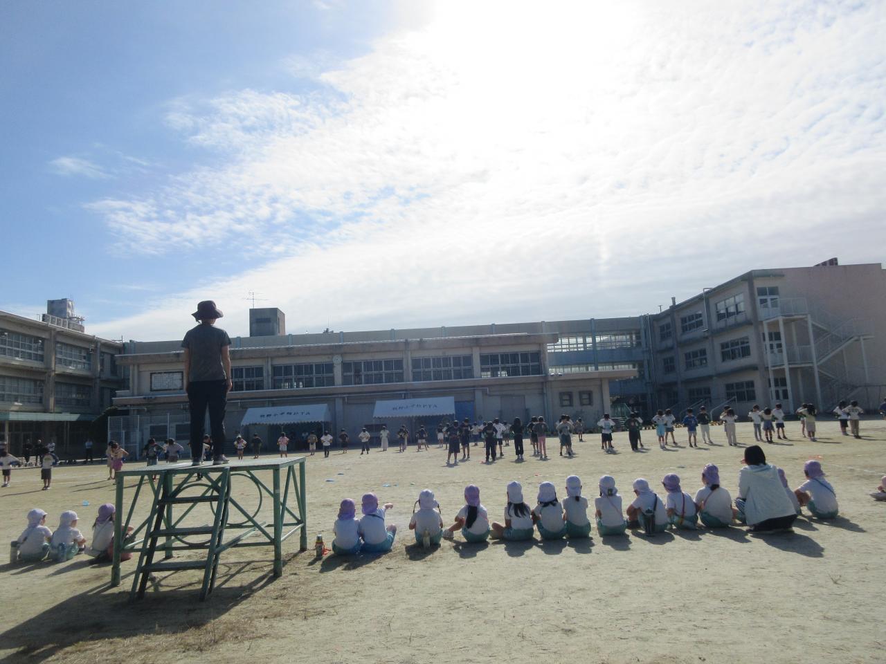 本日(10/10)、牧野小学校運動会のリハーサル、1年生が練習を行う時間帯に、保育園と小学校との連携として、5歳児クラスが見学に行かせていただきました🎵