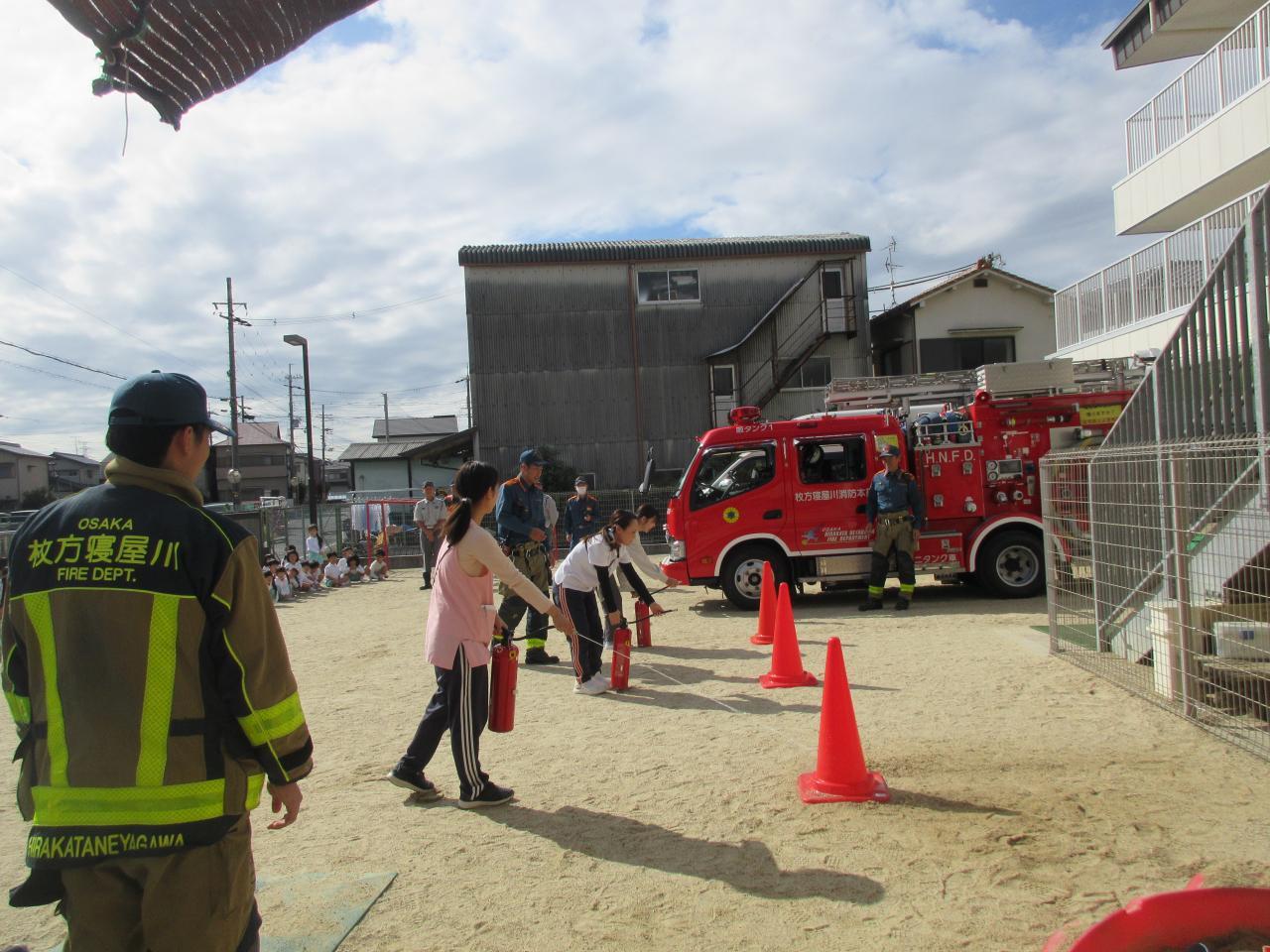火事を見つけたら、まずは助けを呼ぶ。消火器の届く距離は3~5mで、消火器を使う時はホースの先端をもつなど、消火器の正しい使い方についても教えてくださり、水の入った消火器を使って、先生の消火活動の訓練もしました🧯
