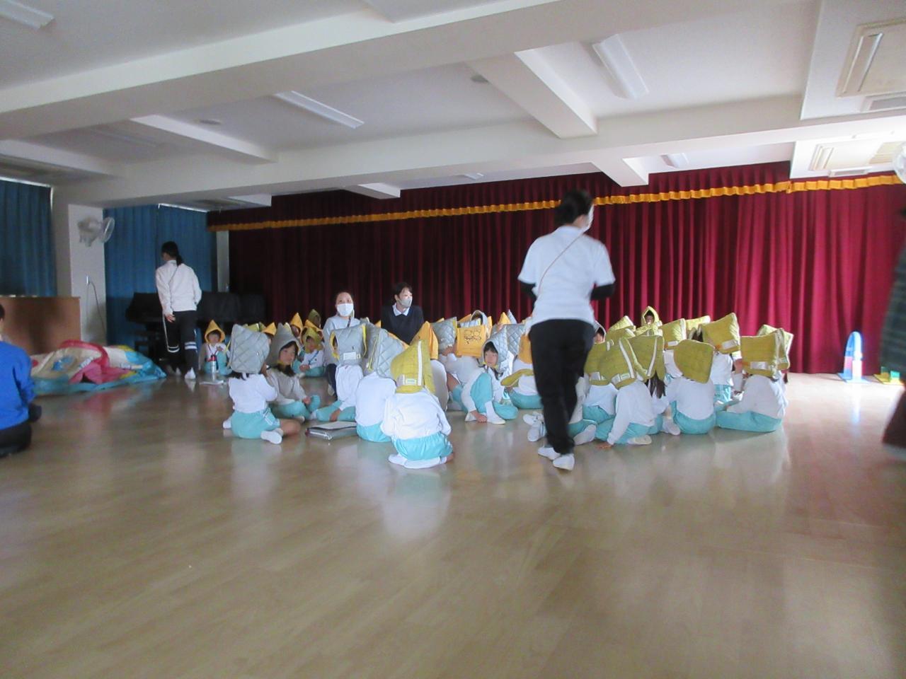 毎月、避難訓練を行っていますが、今回は保育者の携帯電話のアラートが一斉に鳴ったこともあり、びっくりした子もいましたが、放送が入ると先生の話をよく聞き、ダンゴ虫のポーズで身を守る行動をとることができていました😊