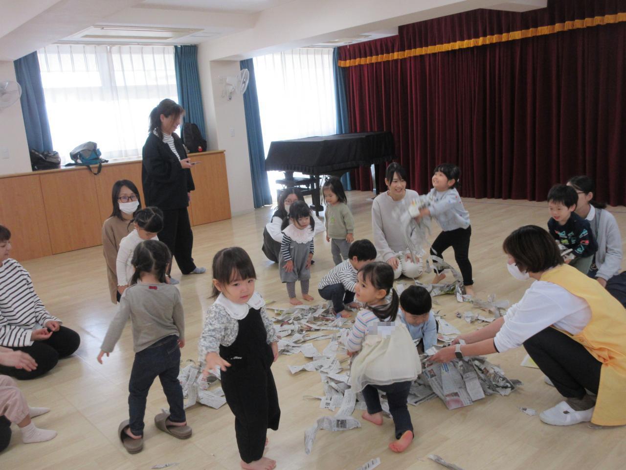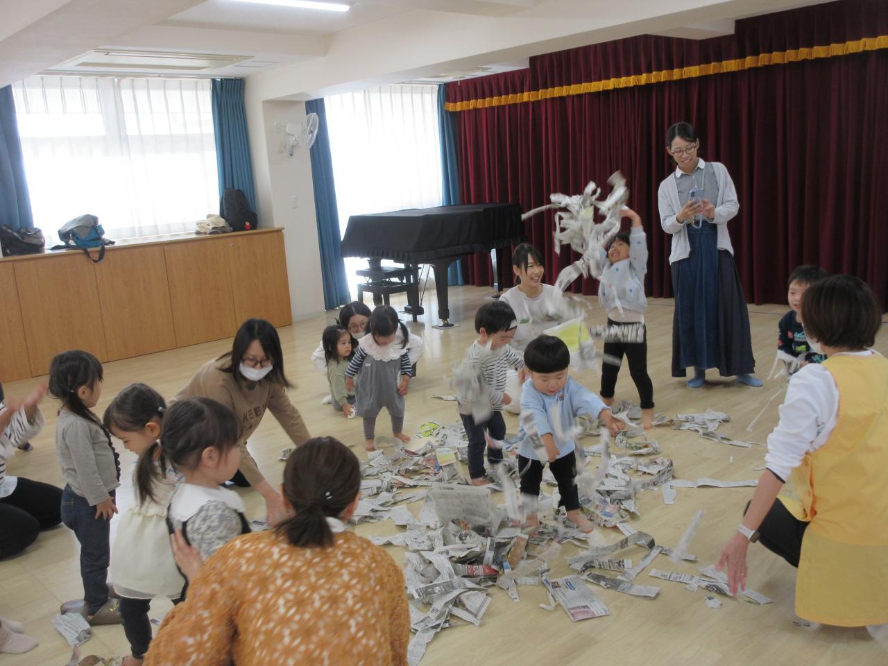 大きい新聞紙を上手にビリビリと破いたり、指先を使って小さくちぎったり、丸めてボールを作ったり、新聞紙のシャワーは、大喜びで楽しんでいましたよ🎵