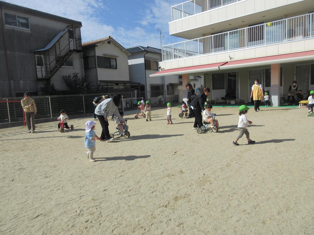 その後は、園庭で三輪車、すべり台、砂場あそびなど、色々なあそびに興味を持ち、体を動かしながら楽しみました😃