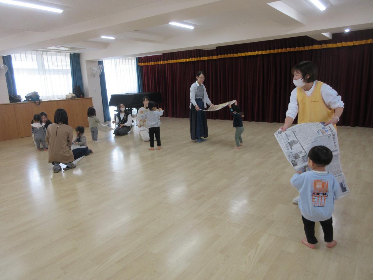 今回は、新聞紙使ってあそび、初めは一枚の新聞紙を広げて楽しみました。