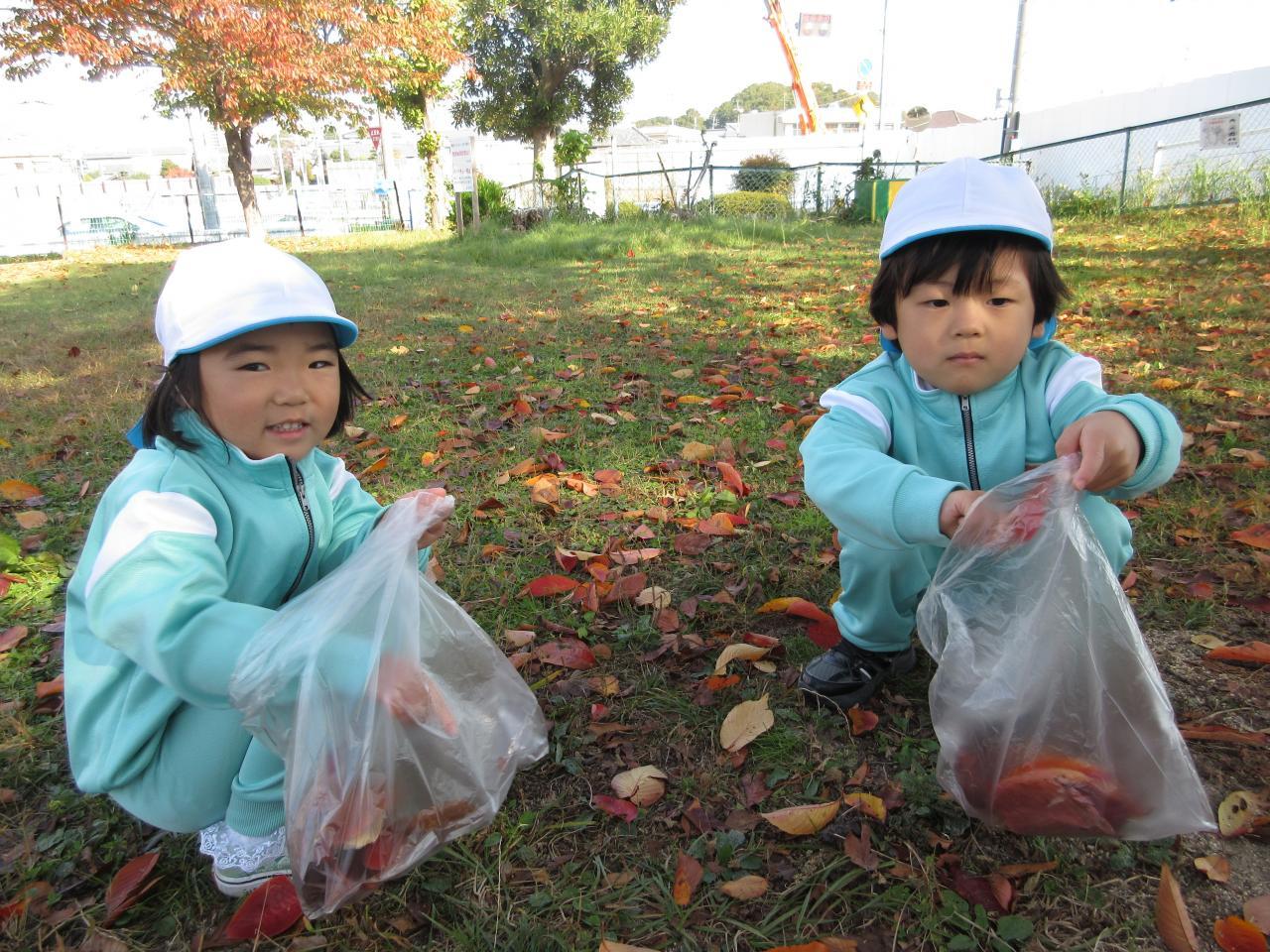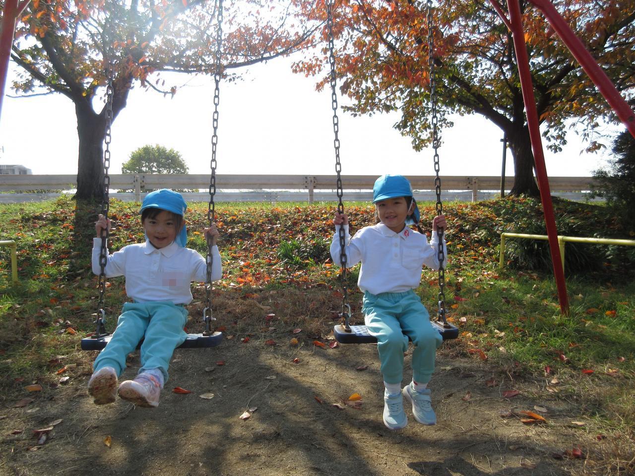 公園では、ブランコやすべり台の遊具を楽しんだり、落ち葉を拾い集めたりしました🍂また、クラスみんなで、おにごっこもしました!