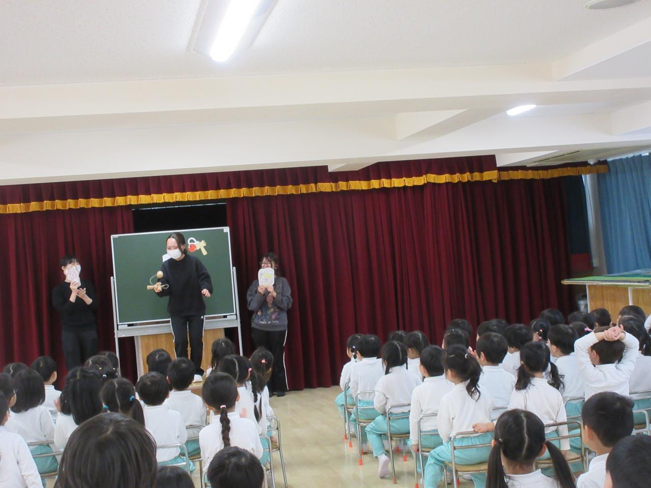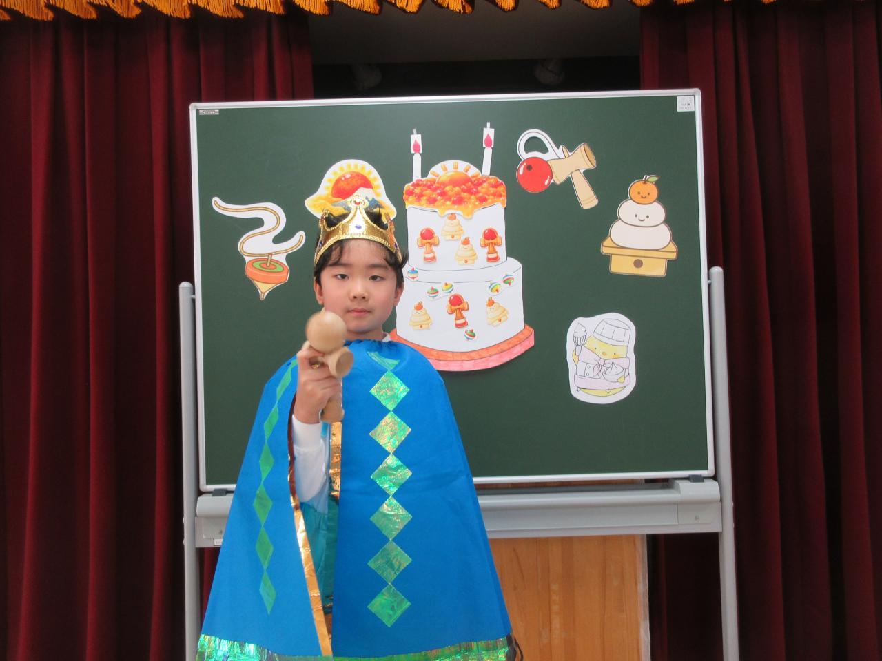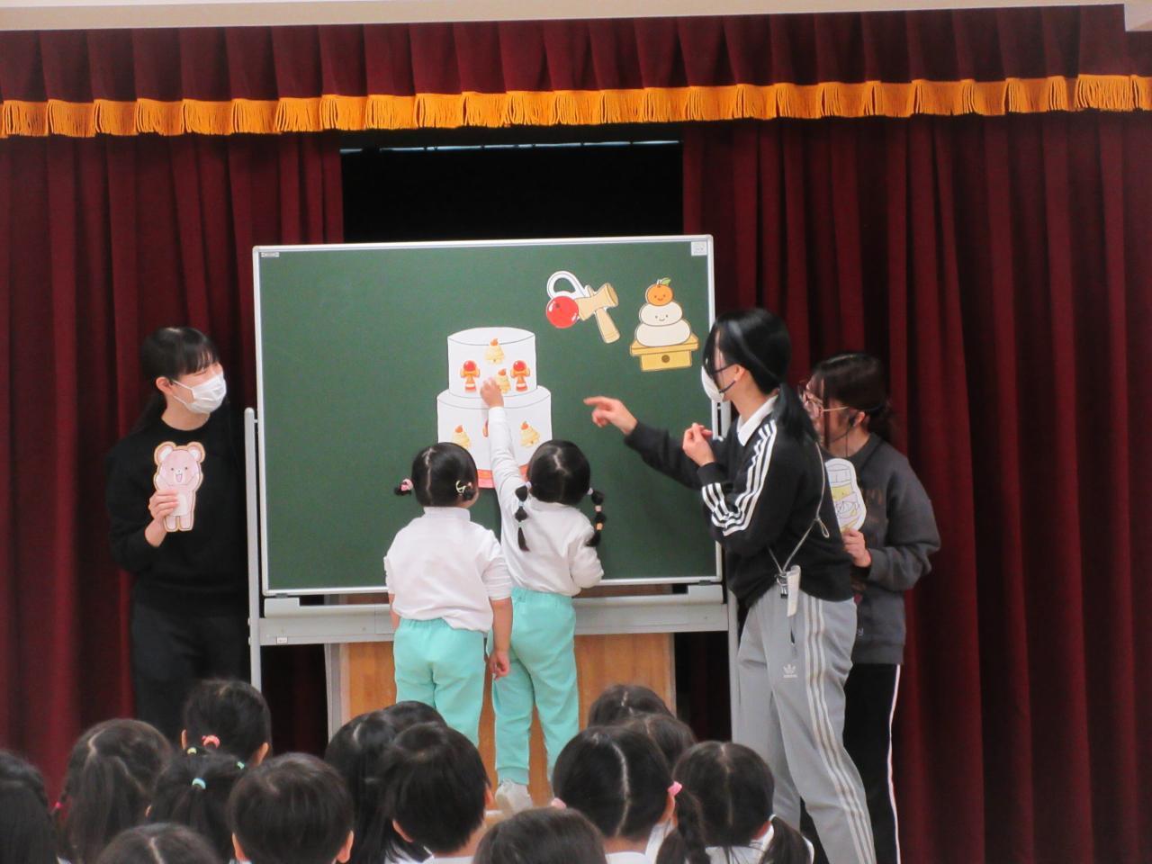 ケーキの飾りが、お正月にちなんだ物で、けん玉やこま、鏡もちなど子どもたちの知っているものが出てきたので、くまさんとひよこちゃんの質問に元気に答えたり、先生を応援したり、とても盛り上がりみんなで楽しみました😊