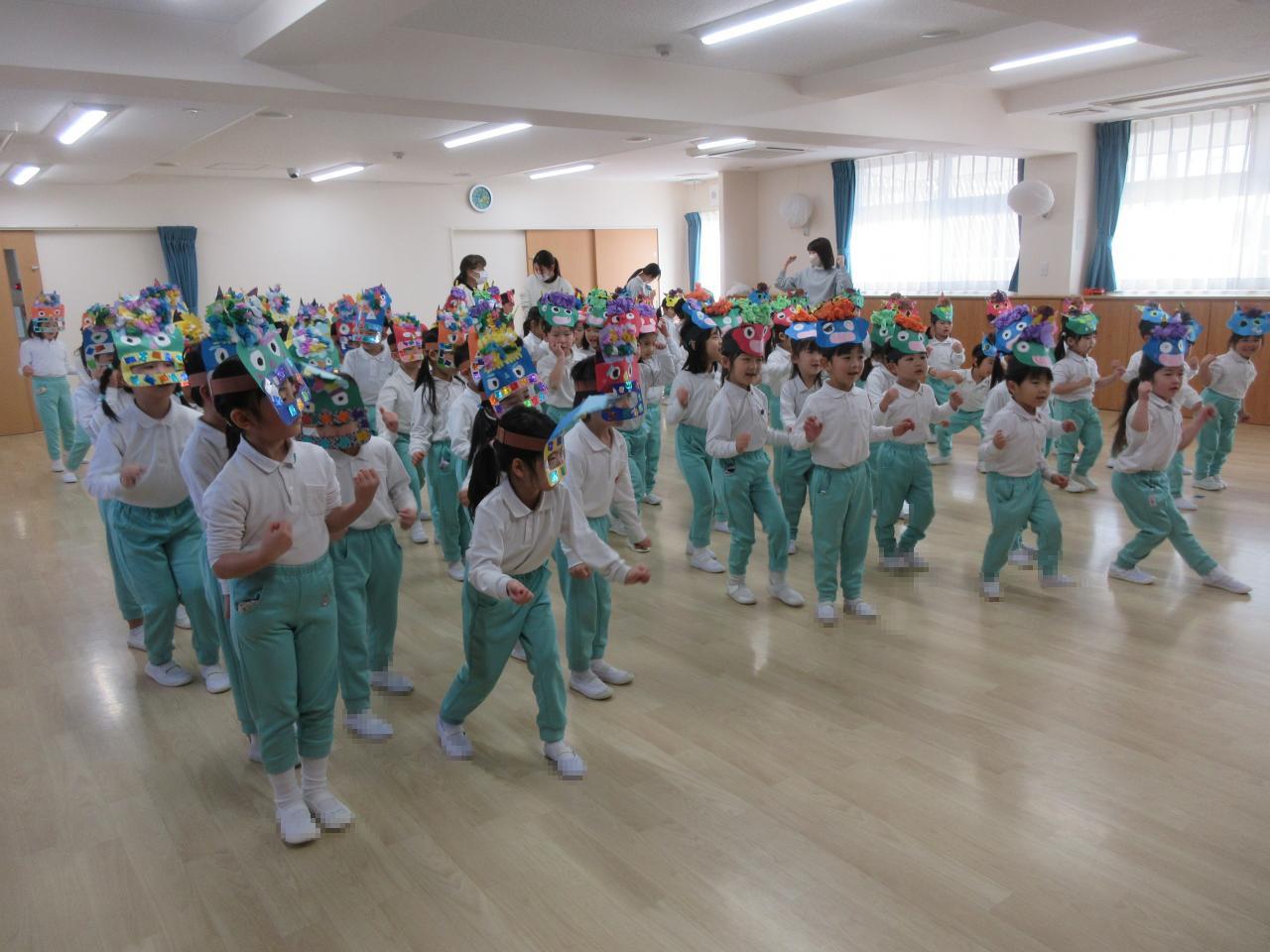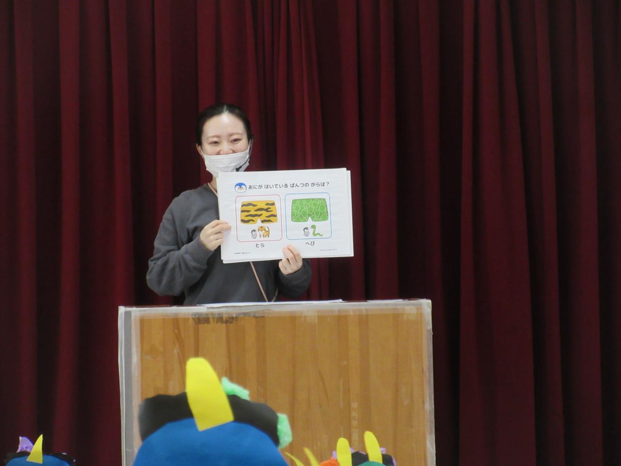 幼児クラスはお遊戯室に集まり、節分についてのお話を聞きました。