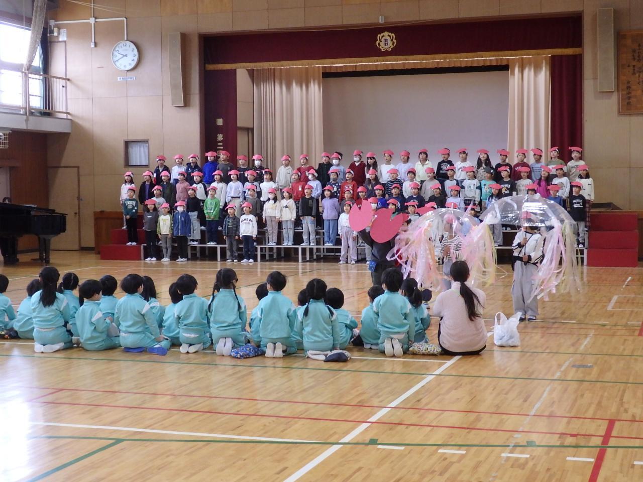 まずは、体育館に入って、1年生のオペレッタ『スイミー』の練習を見学させていただきました。大きな体育館と、とっても上手な声に、圧倒されました👏